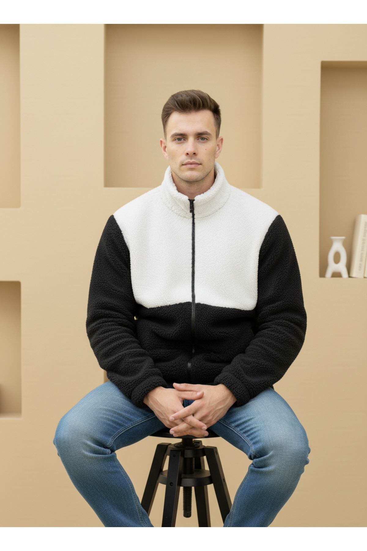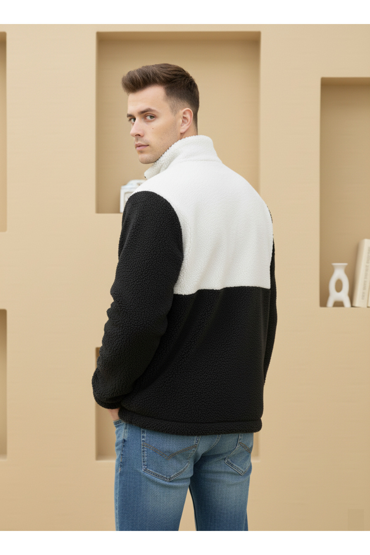 Unisex, Siyah-Beyaz, Renk Bloklu, Fermuarlı, Dik Yaka, Sherpa, Polar, Ceket Unisex, Siyah-Beyaz, Renk Bloklu, Fermuarlı, Dik Yaka, Sherpa, Polar, Ceket GHT001 2XL