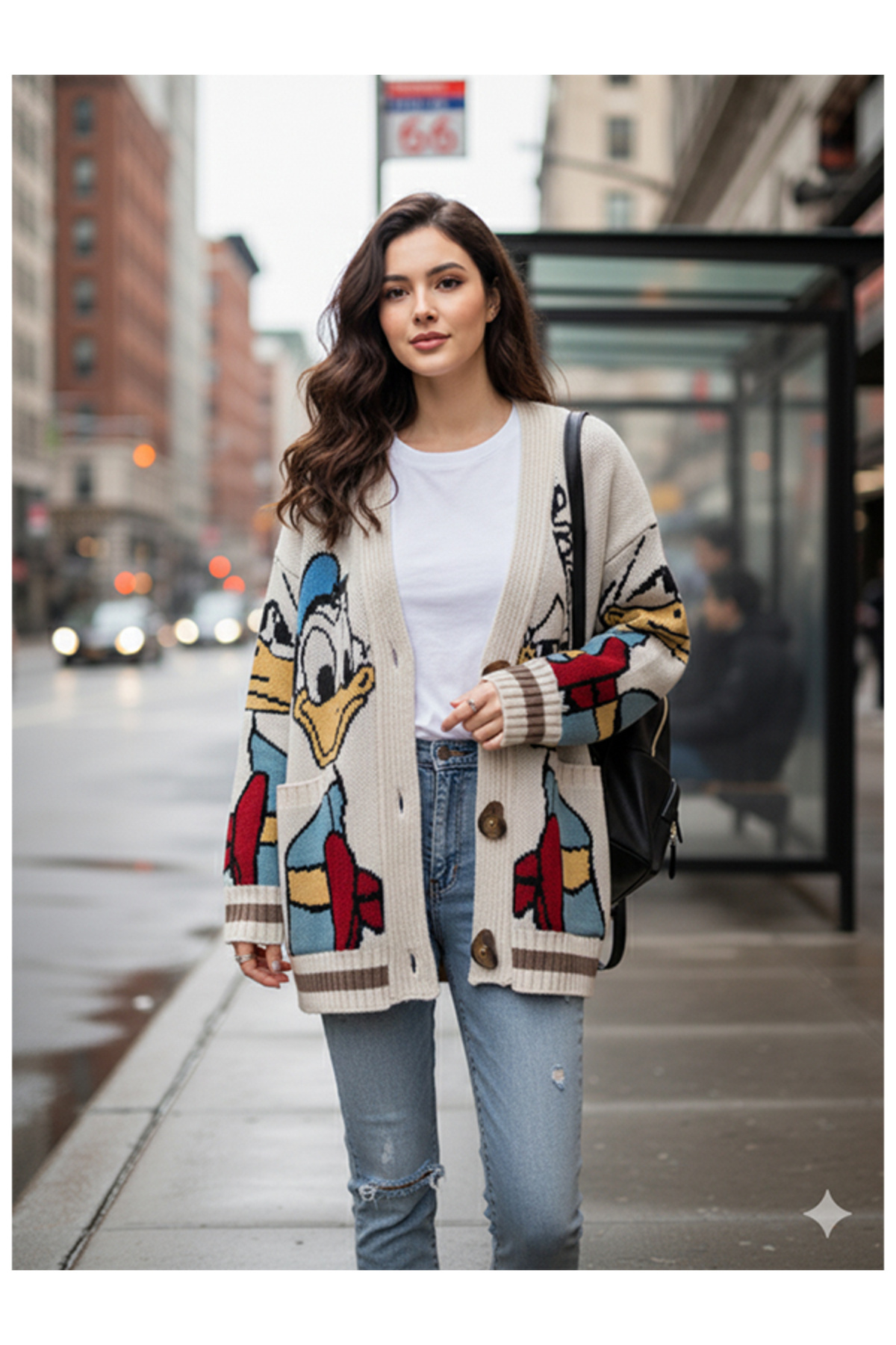 Kedi yüzleri desenli midi boy v yaka unisex hırka Kedi yüzleri desenli midi boy v yaka unisex hırka NVHITRE-GR68 L/XL