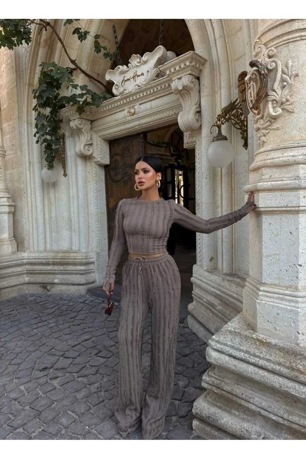Kadın Vizon Parmak Geçmeli Bluz ve Bol Paça Pantolon Fırfır Detaylı Gagari Takım Kadın Vizon Parmak Geçmeli Bluz ve Bol Paça Pantolon Fırfır Detaylı Gagari Takım 4081 L