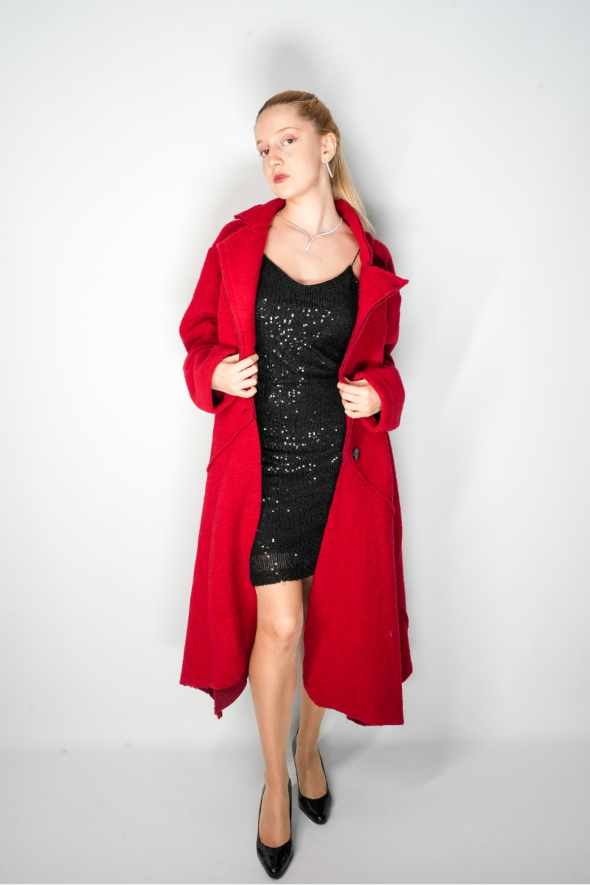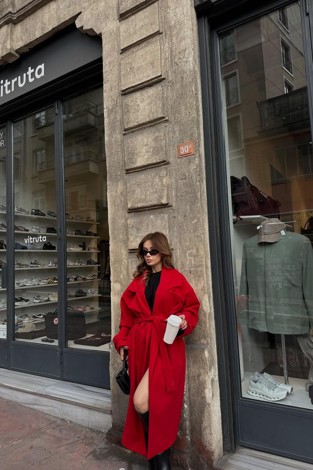 Kuşaklı Düğmeli Kaşe Kaban Kırmızı Kuşaklı Düğmeli Kaşe Kaban Kırmızı TX9AD2483640122 L