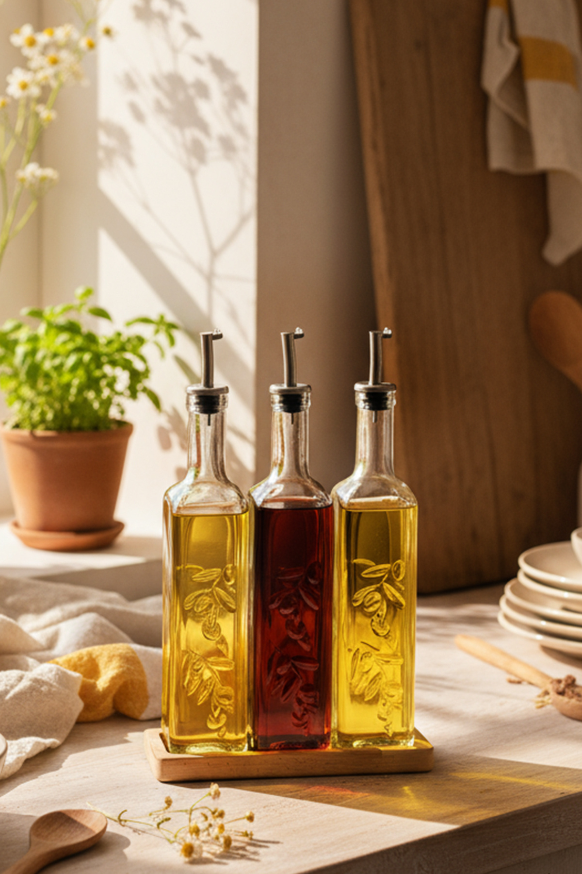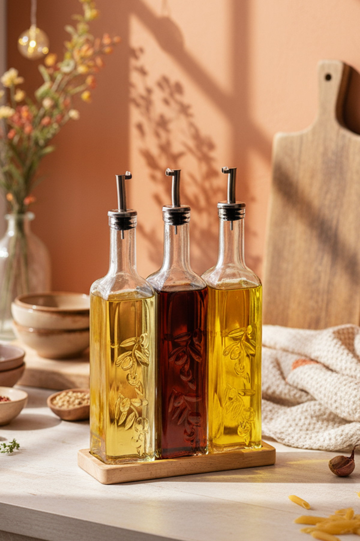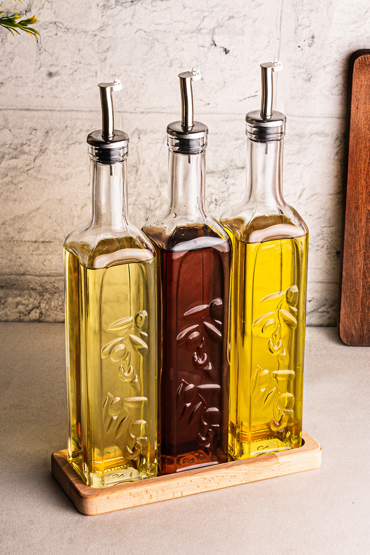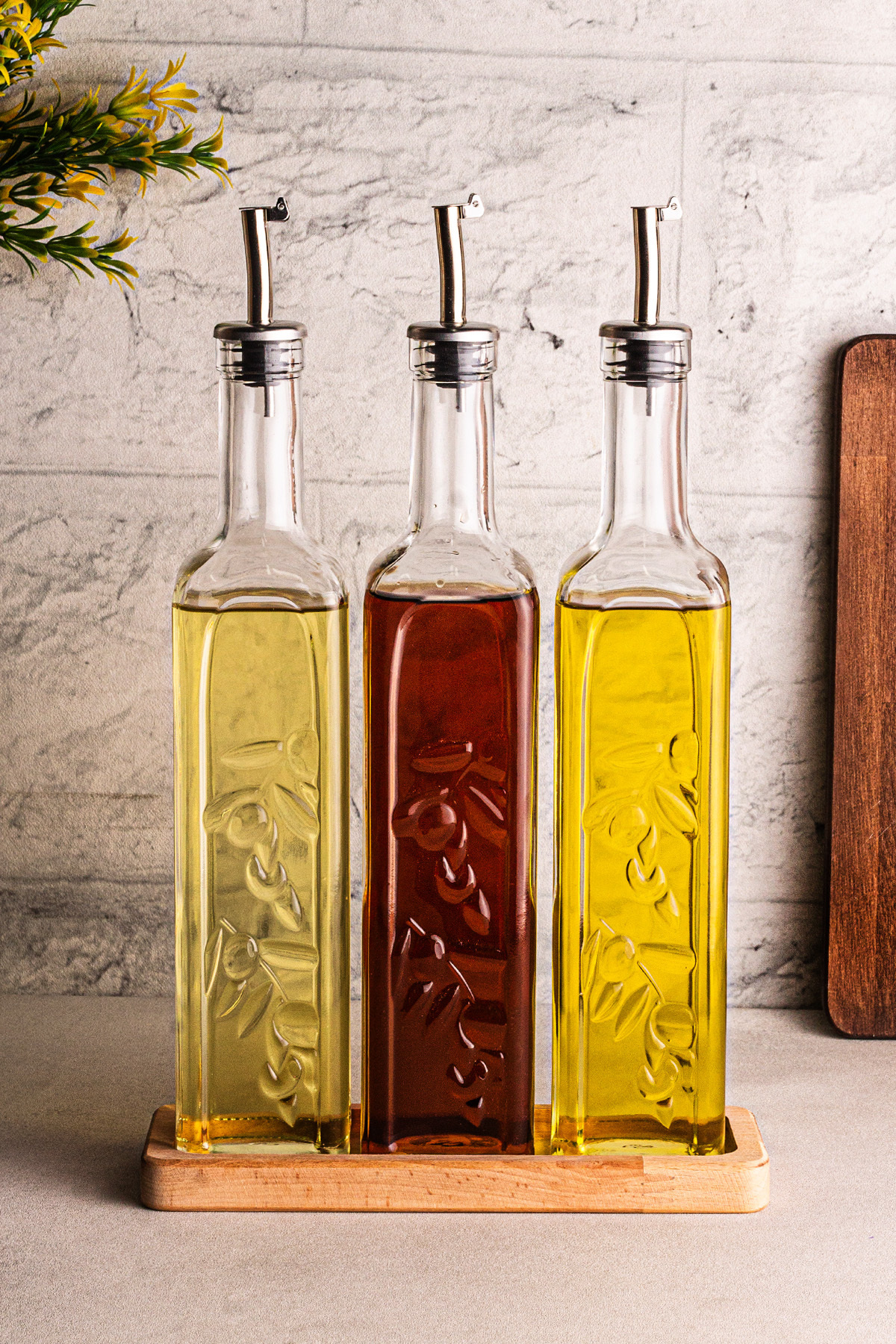 Safir - Ahşap Standlı 3'lü Cam Damlatmaz Yağlık Sirkelik Zeytinyağı Sıvıyağ Şişesi Yağdanlık 500ml Safir - Ahşap Standlı 3'lü Cam Damlatmaz Yağlık Sirkelik Zeytinyağı Sıvıyağ Şişesi Yağdanlık 500ml SNPSAFİR3 تک سایز