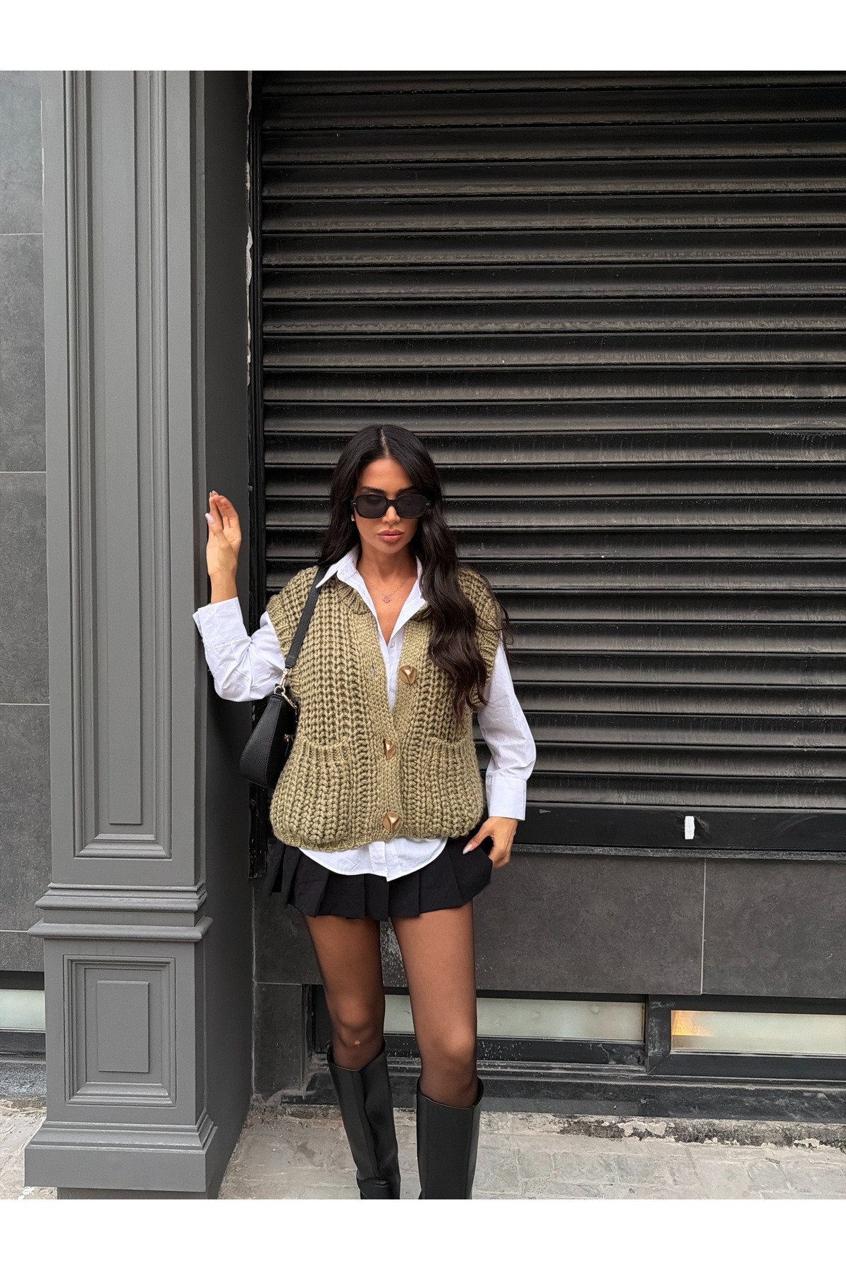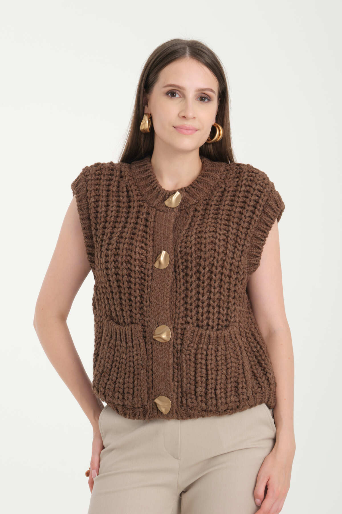 Örgülü Önü Düğmeli Oversize Kolsuz Triko Yelek Örgülü Önü Düğmeli Oversize Kolsuz Triko Yelek 25K003735 Standart
