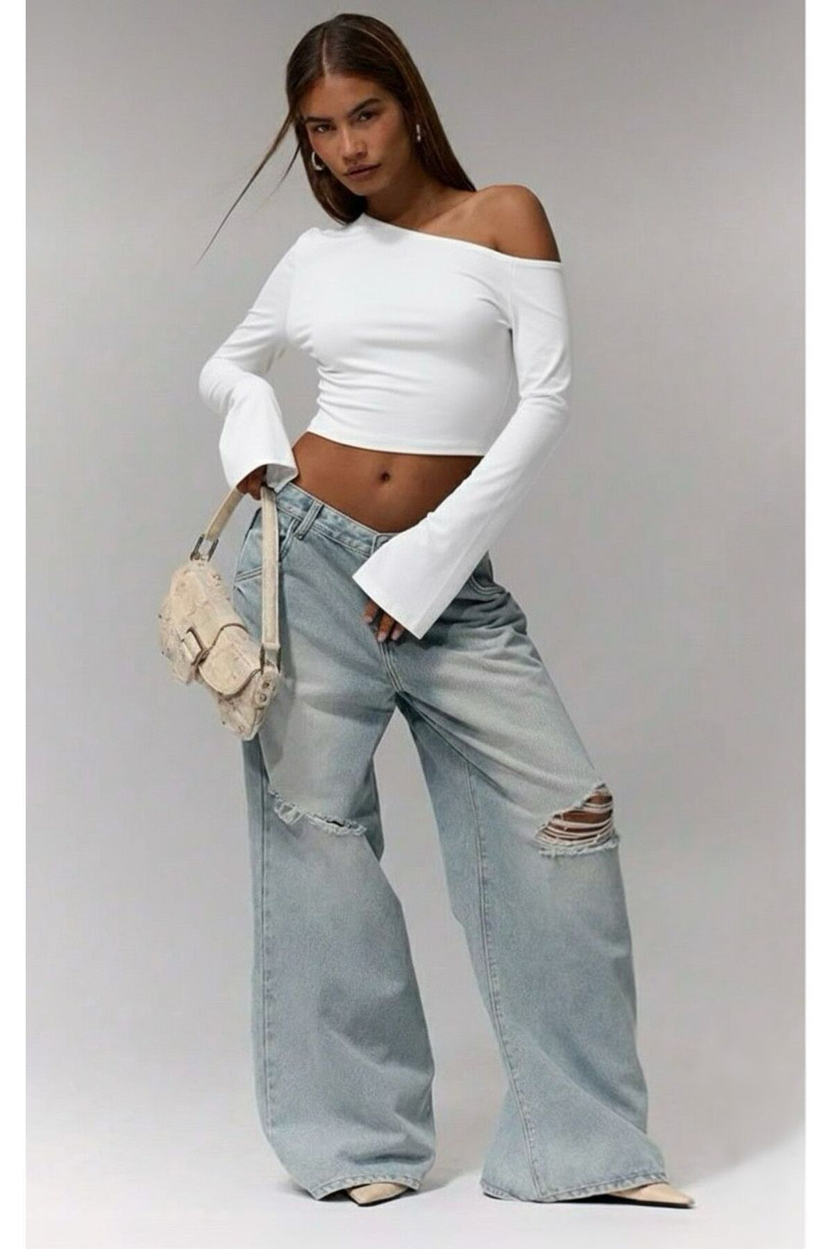 Tek Omzu Açık Asimetrik Yaka İspanyol Kol Esnek Ekru Crop Bluz Tek Omzu Açık Asimetrik Yaka İspanyol Kol Esnek Ekru Crop Bluz 9165 L