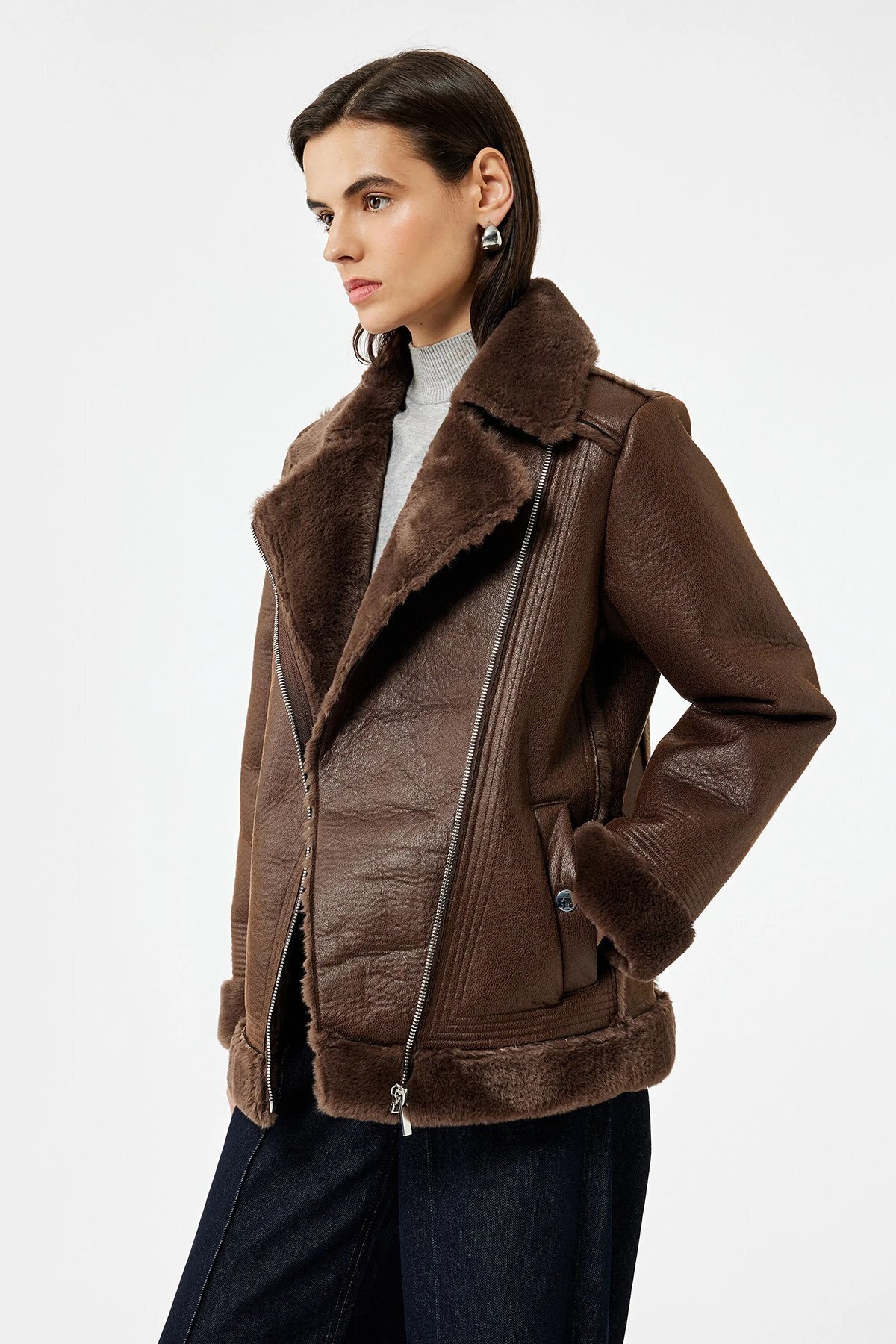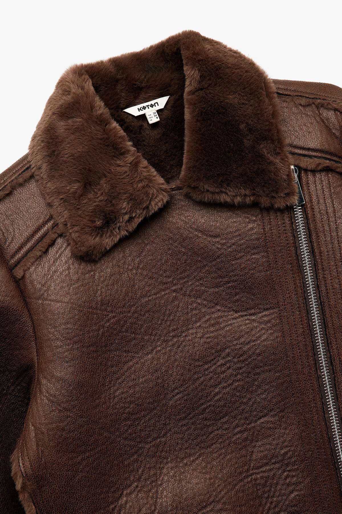 Kadın Peluş Astarlı Uzun Kollu Yakası Suni Kürklü Kruvaze Deri Görünümlü Ceket 6WAK Kadın Peluş Astarlı Uzun Kollu Yakası Suni Kürklü Kruvaze Deri Görünümlü Ceket 6WAK 25k009463b0004 42