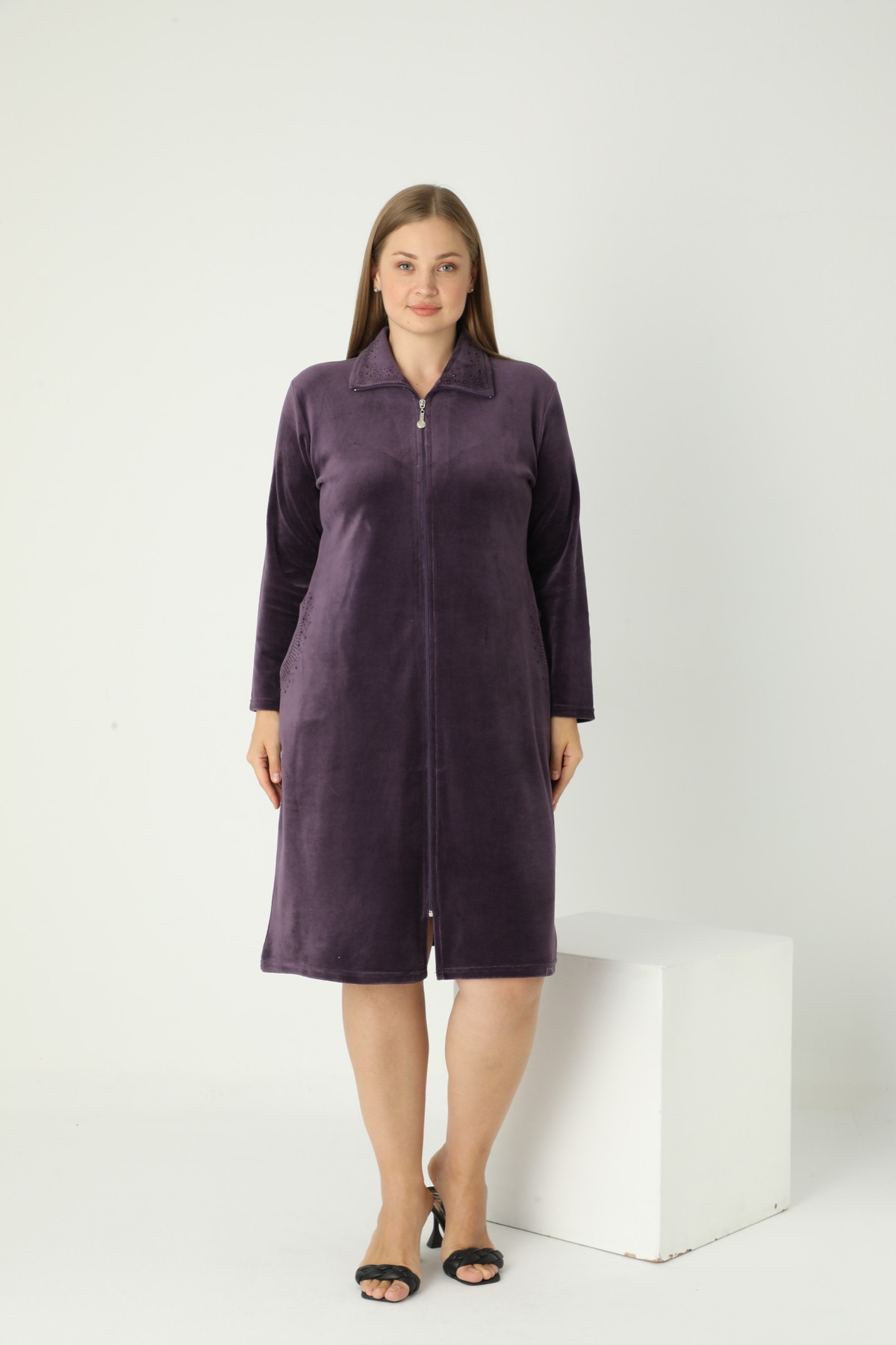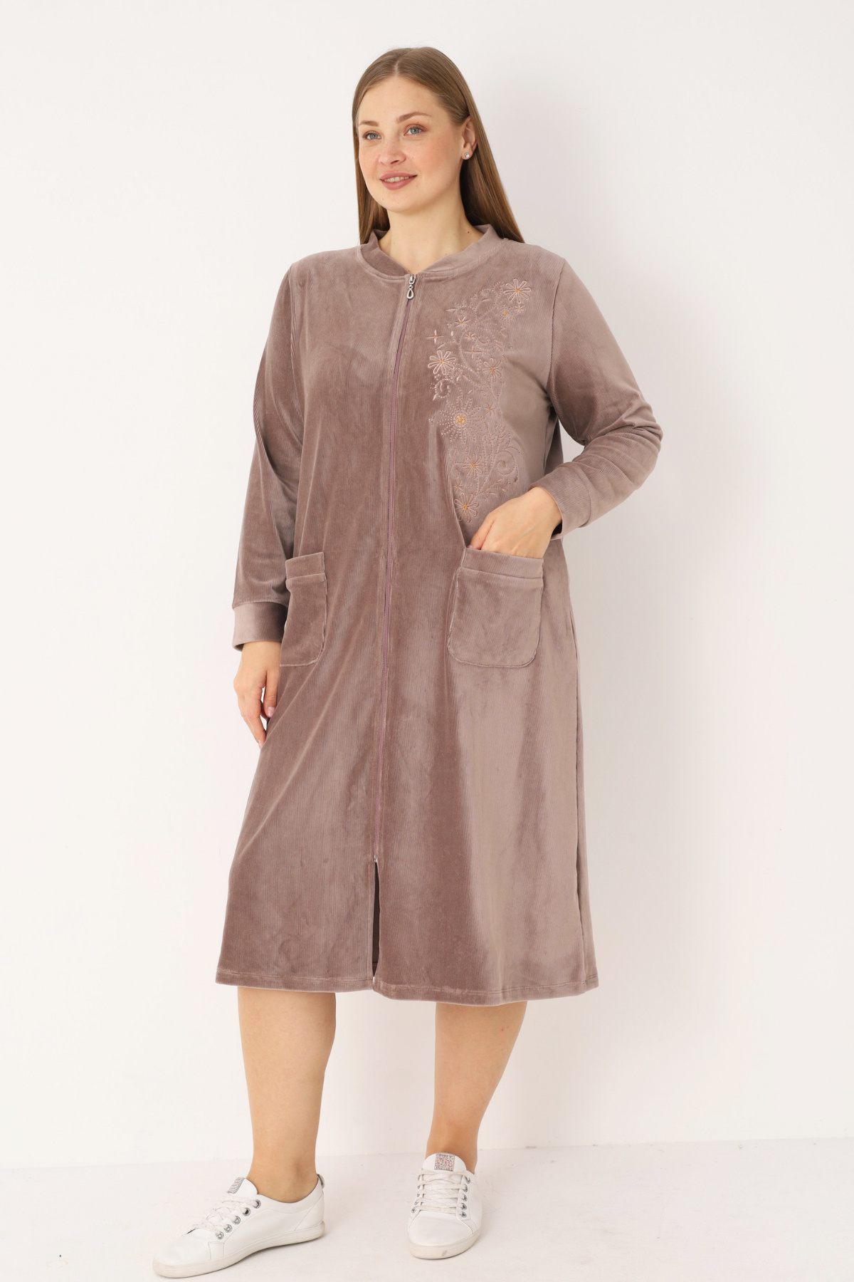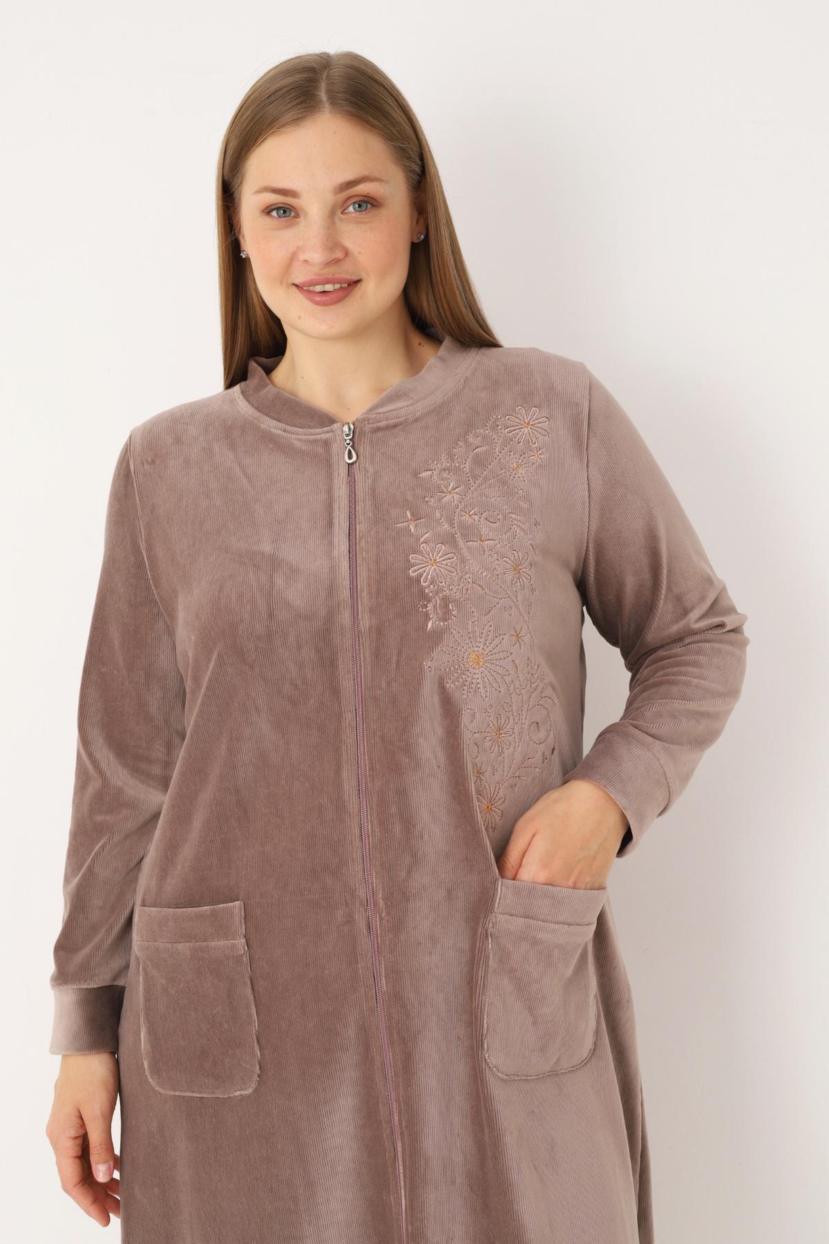 Sütlü Kahve Nakış Ve Taş Detaylı Pamuklu Kadife Fermuarlı Uzun Kollu Kadın Büyük Beden Elbise Sütlü Kahve Nakış Ve Taş Detaylı Pamuklu Kadife Fermuarlı Uzun Kollu Kadın Büyük Beden Elbise 26058 4XL