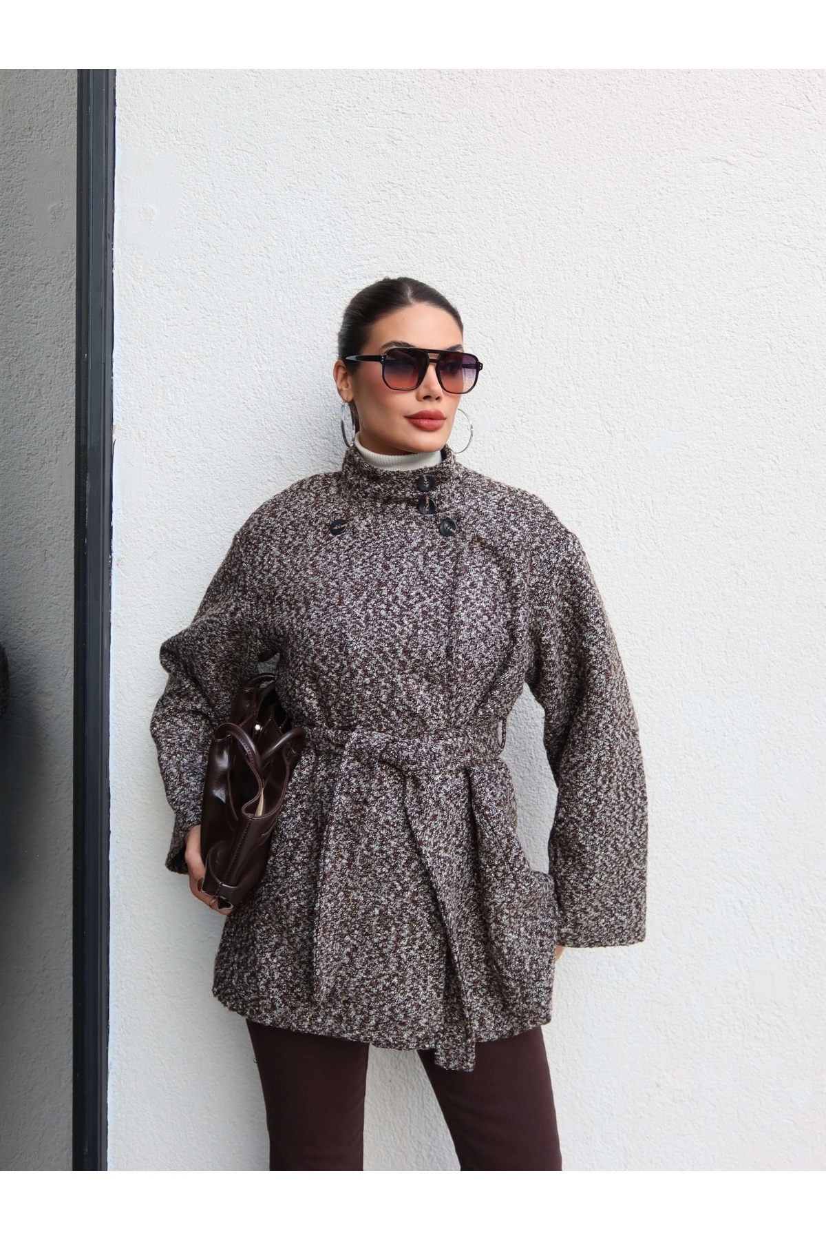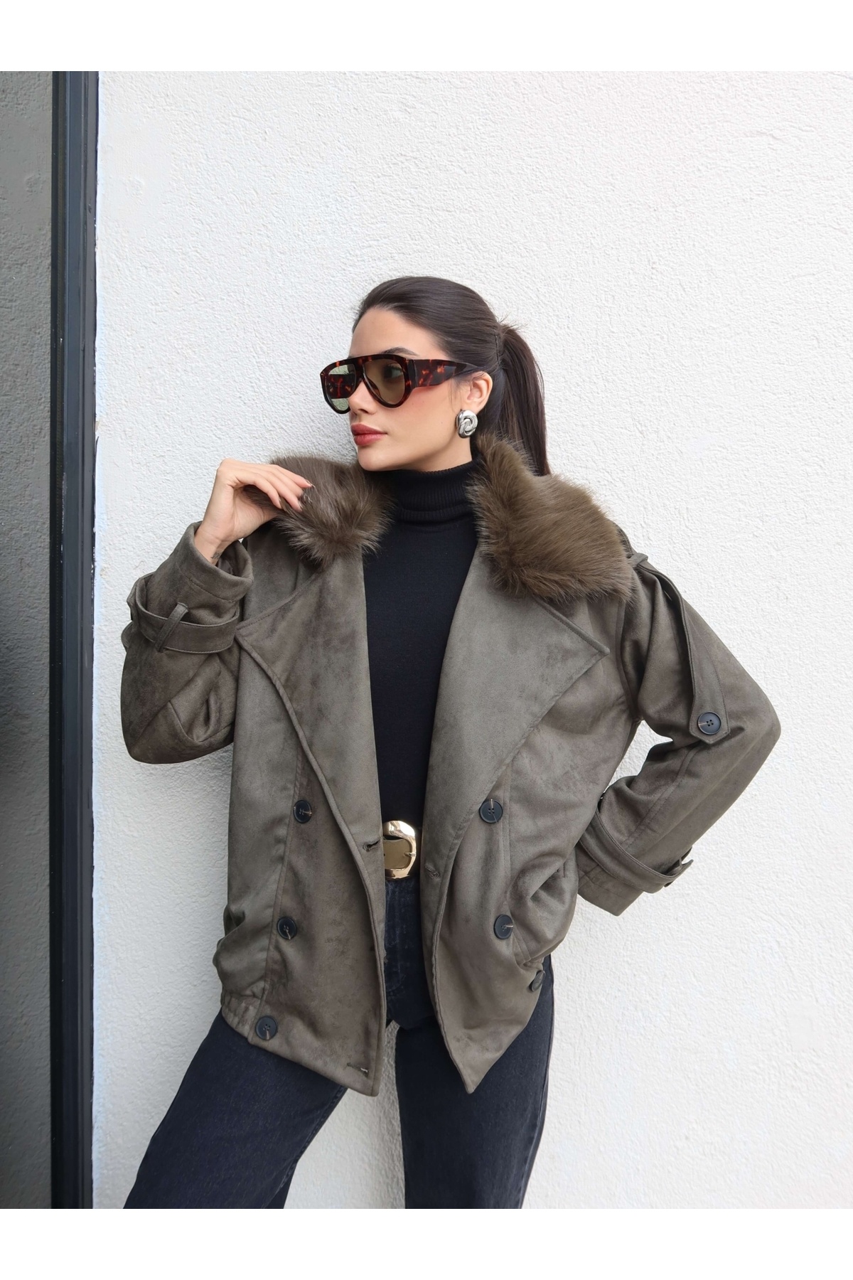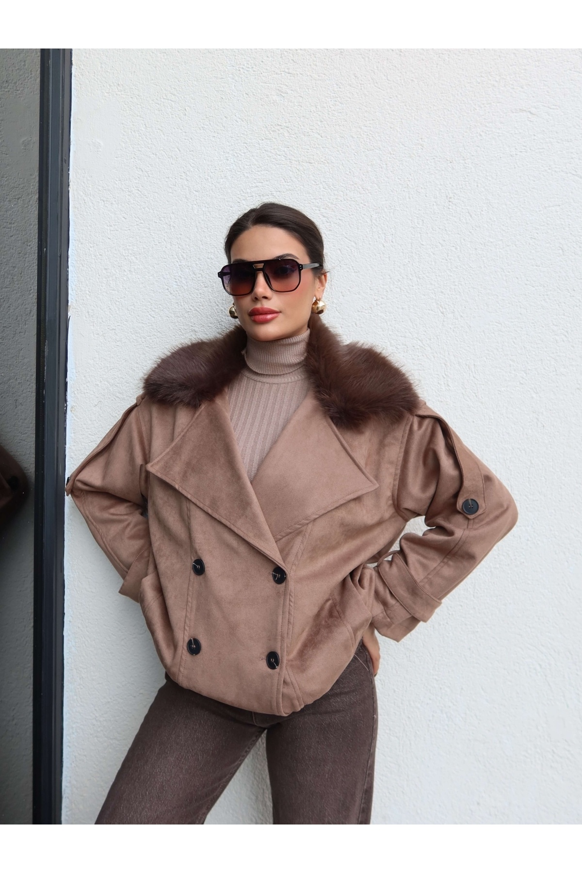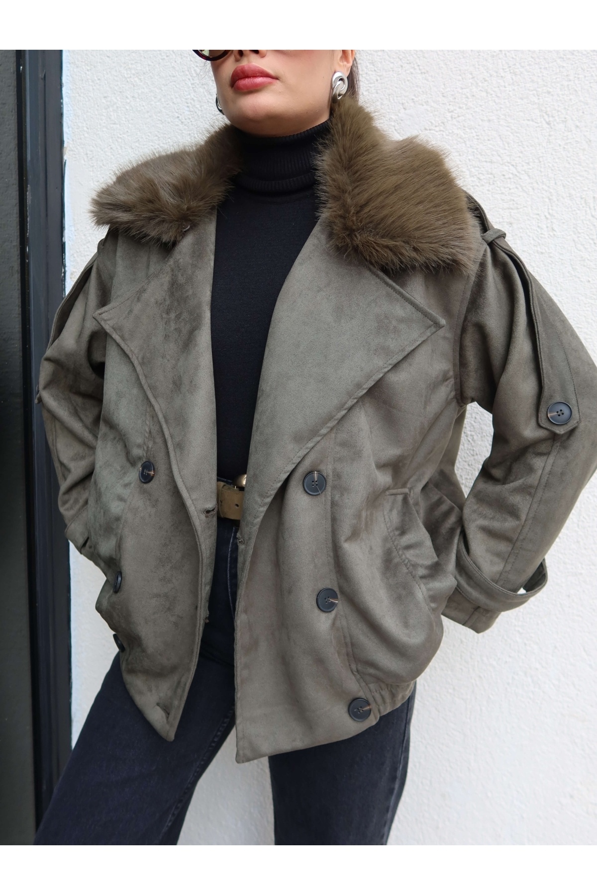 Kürk Yaka Bel Lastik Süet Ceket Kürk Yaka Bel Lastik Süet Ceket EH-6117 L