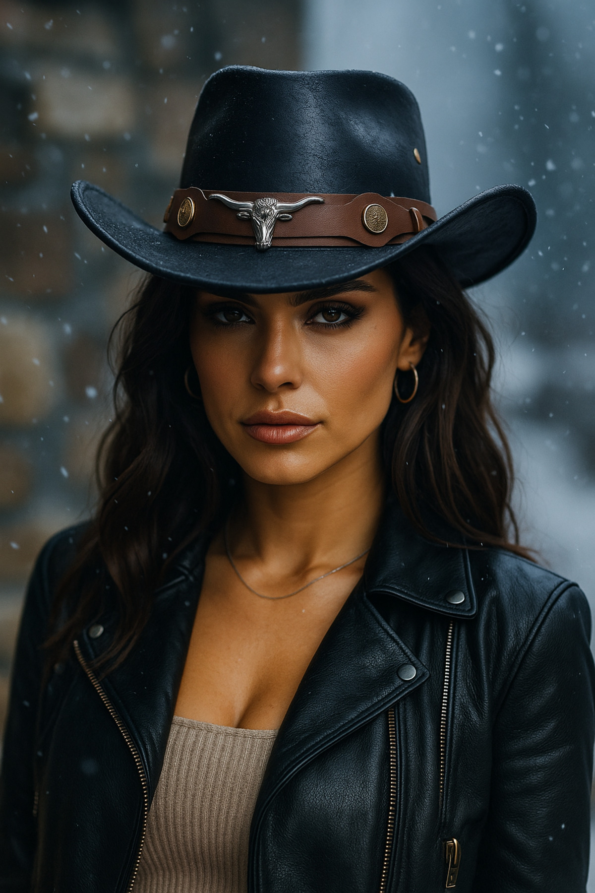 Siyah Deri Görünümlü Kovboy Fötr Şapka – Gümüş Boğa Figürlü Taba Deri Kayışlı Western Model Siyah Deri Görünümlü Kovboy Fötr Şapka – Gümüş Boğa Figürlü Taba Deri Kayışlı Western Model SPK1145 Standart