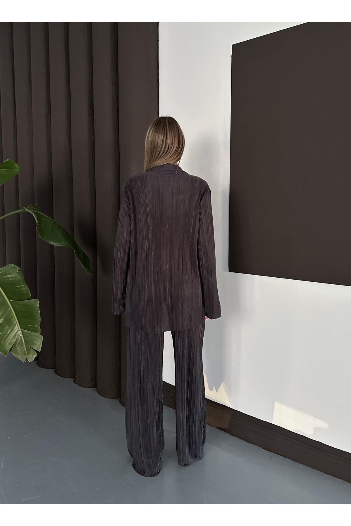 Kadın Pliseli Saten Fitilli Krinkıl Kumaş Antrasit Rengi Pantalon Gömlek Takım Kadın Pliseli Saten Fitilli Krinkıl Kumaş Antrasit Rengi Pantalon Gömlek Takım vera0001 2XL