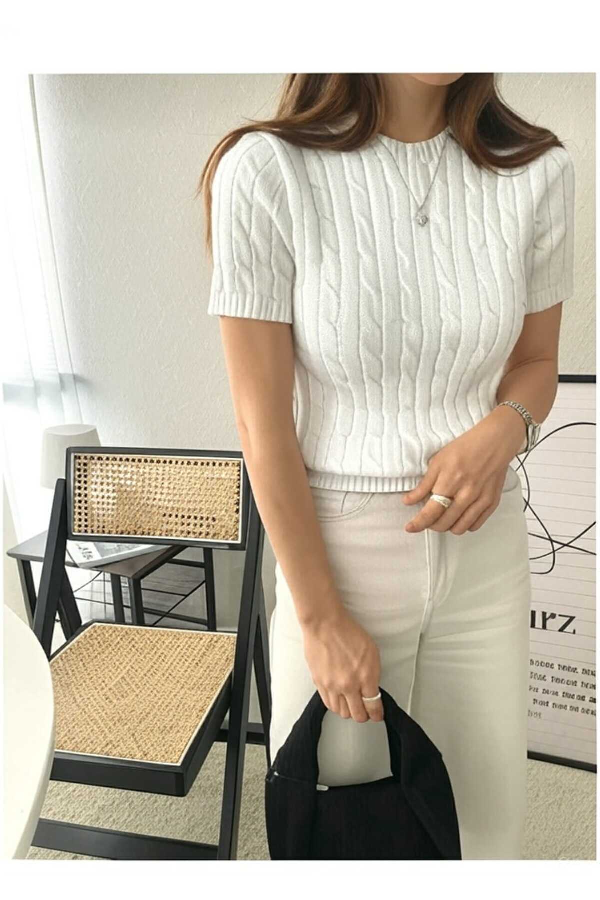Bisiklet Yaka Saçörgü Kısa Kol Triko Kazak Beyaz Bisiklet Yaka Saçörgü Kısa Kol Triko Kazak Beyaz slmt20250029 Standart