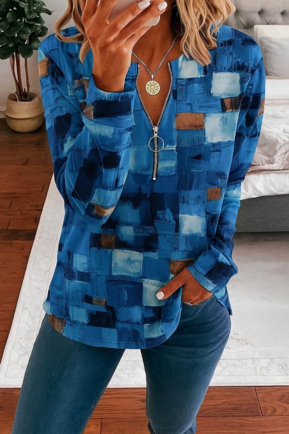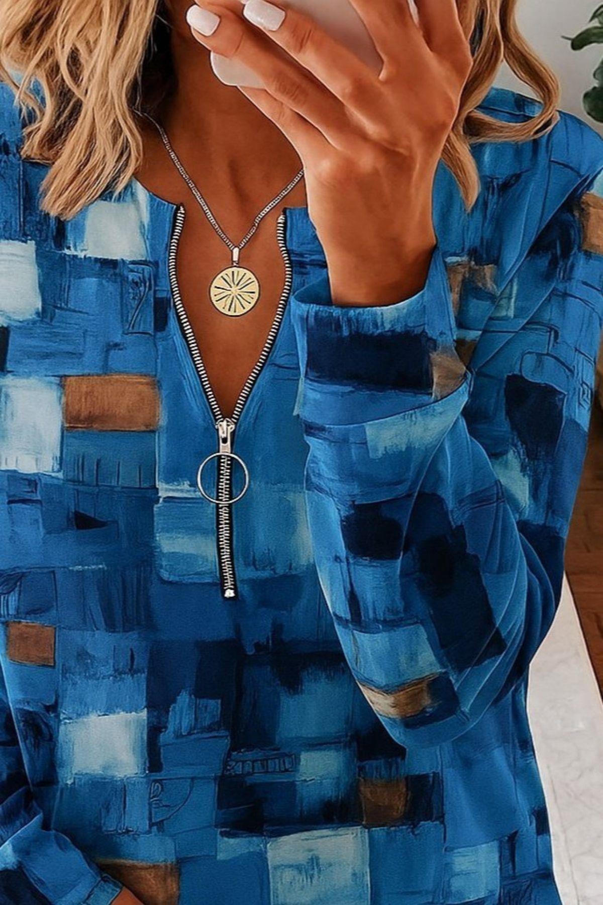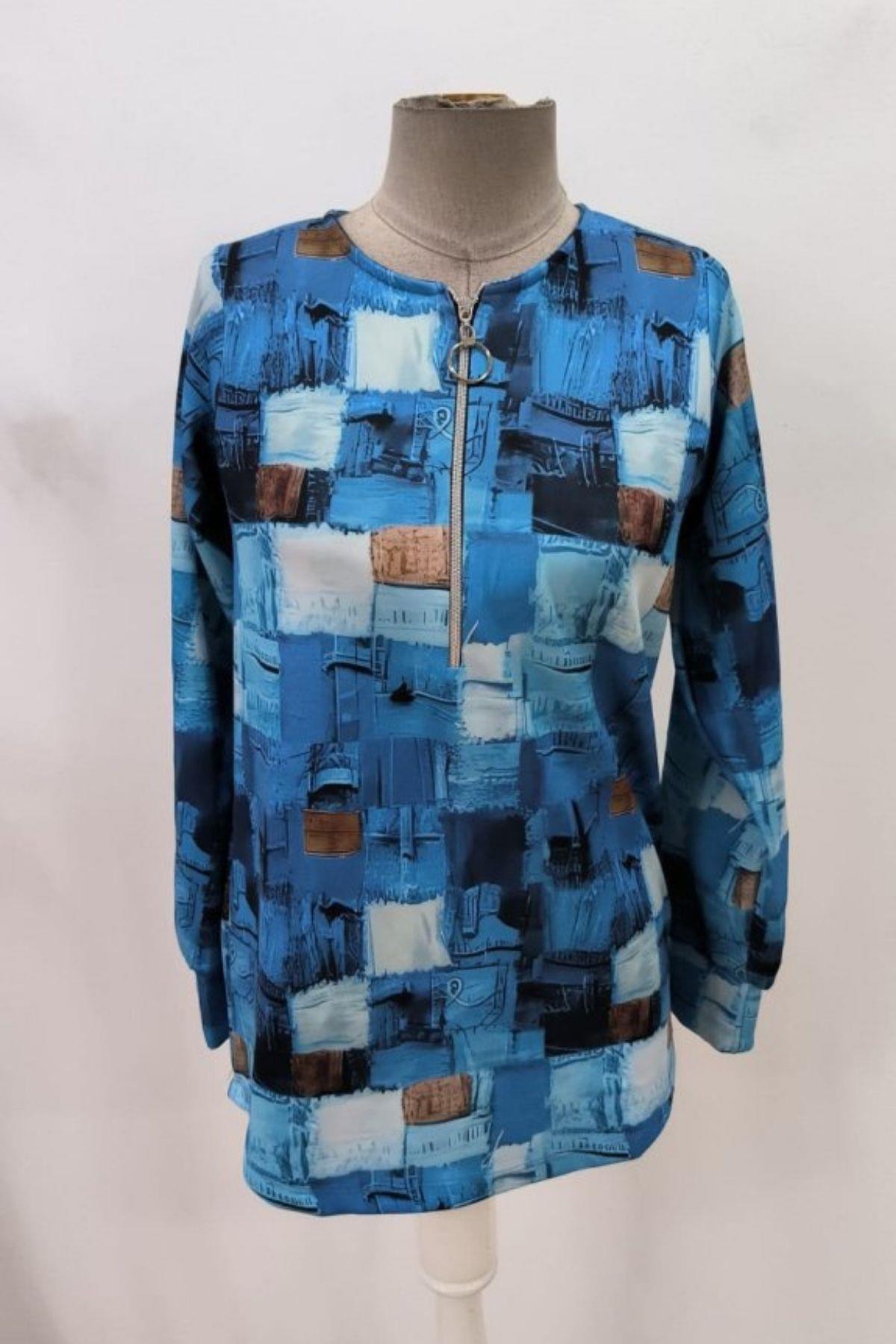 Fermuar Detaylı Desenli Uzun Kollu Bluz - Mavi Fermuar Detaylı Desenli Uzun Kollu Bluz - Mavi JS87193 2XL-3XL