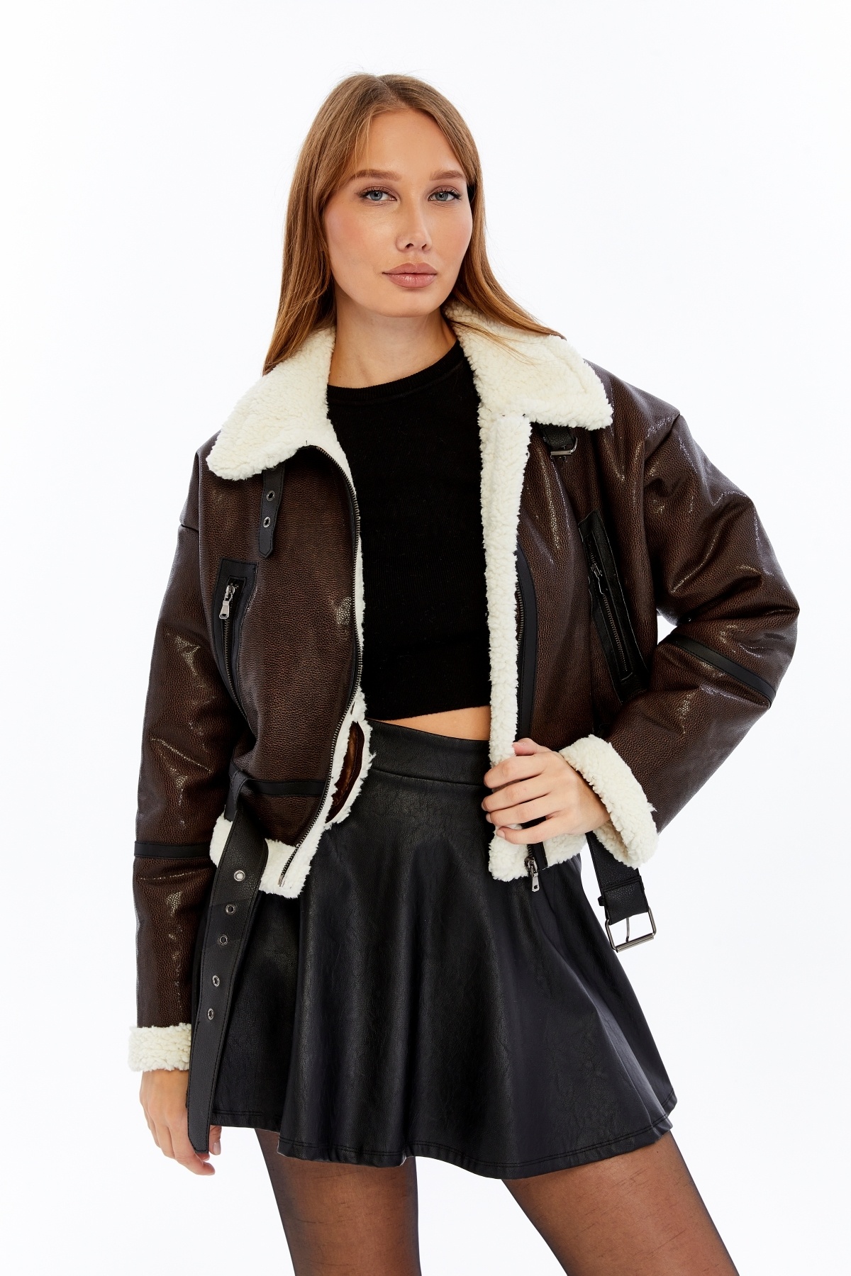 Kadın Kürklü Tokalı Kısa Crop Mont Kadın Kürklü Tokalı Kısa Crop Mont ZR-K L