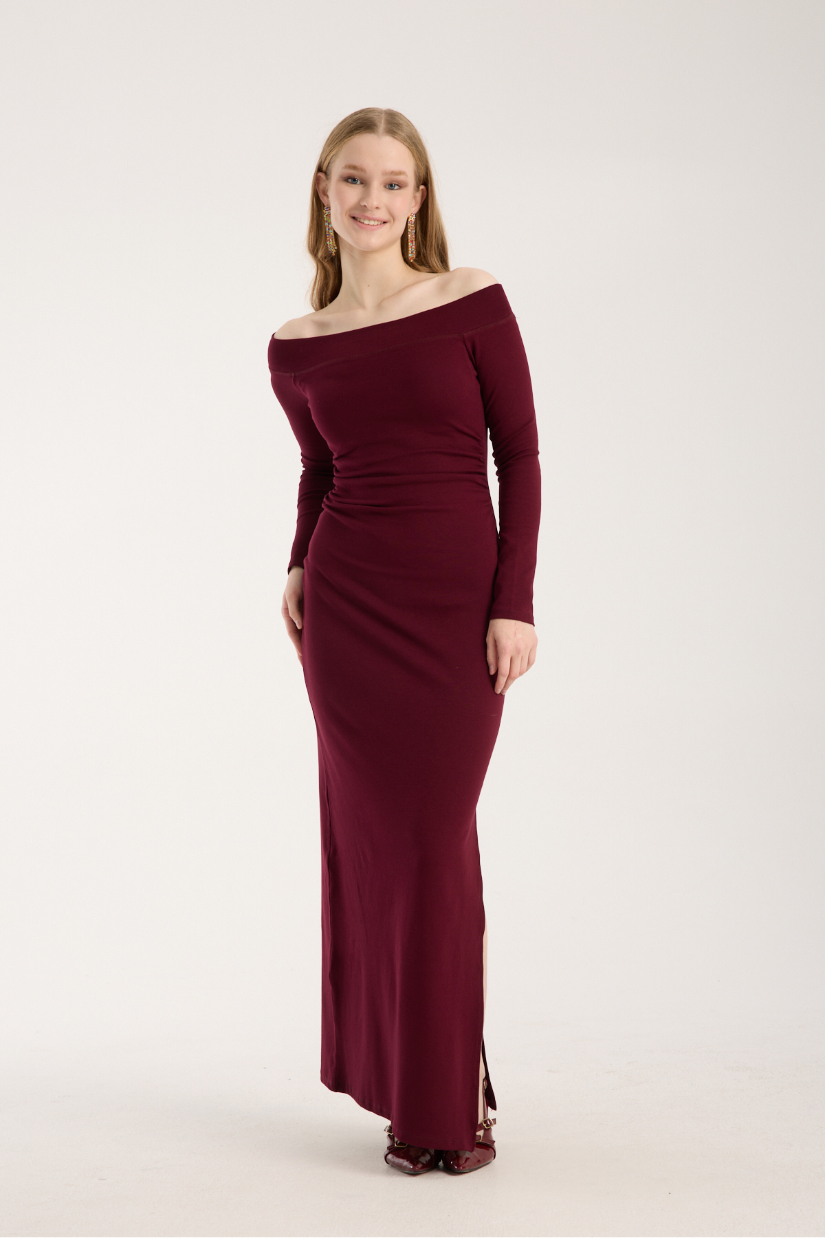 Vişne Çürüğü Büzgülü Fırfır Detaylı Askılı Uzun Elbise Vişne Çürüğü Büzgülü Fırfır Detaylı Askılı Uzun Elbise VK1756 L
