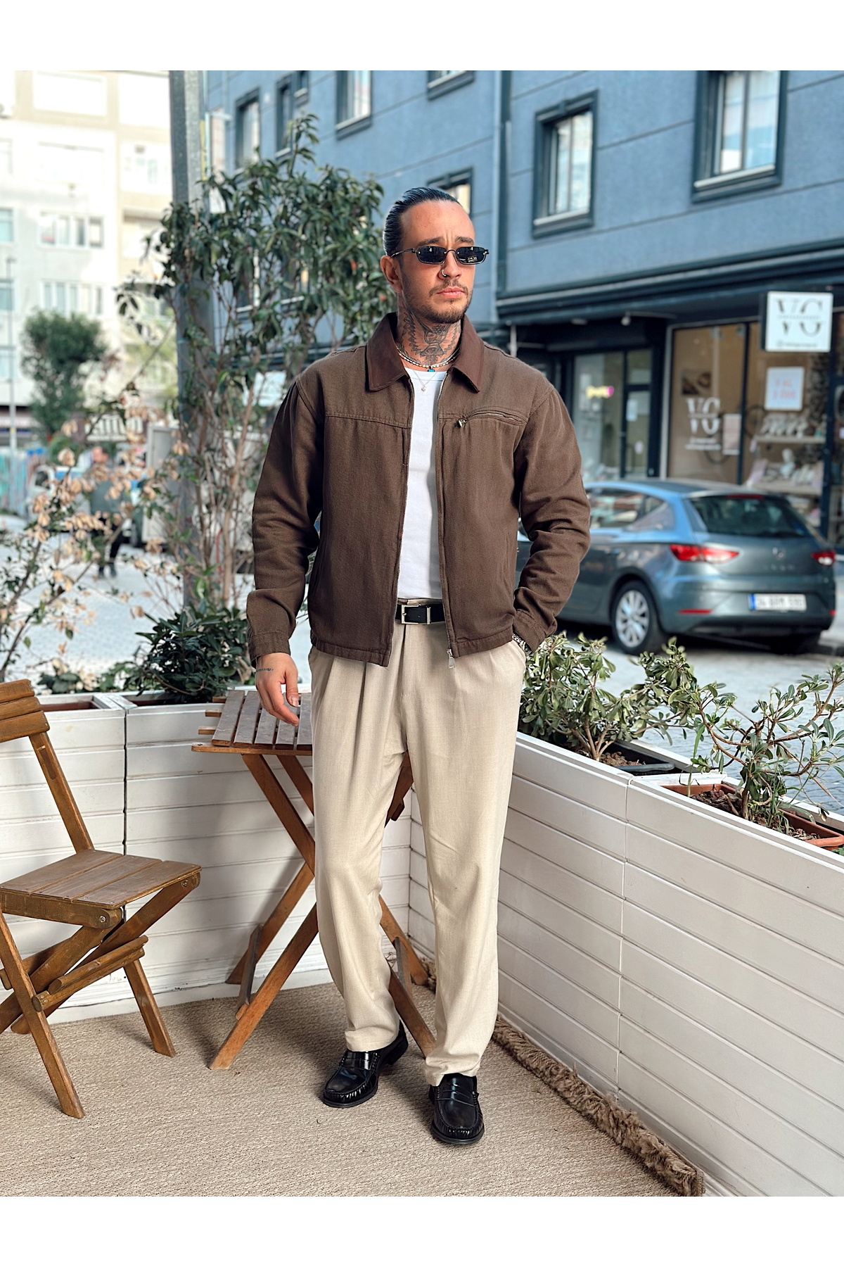Yakası Farklı Renk Gabardin Ceket Kahverengi Yakası Farklı Renk Gabardin Ceket Kahverengi MC4074 XL