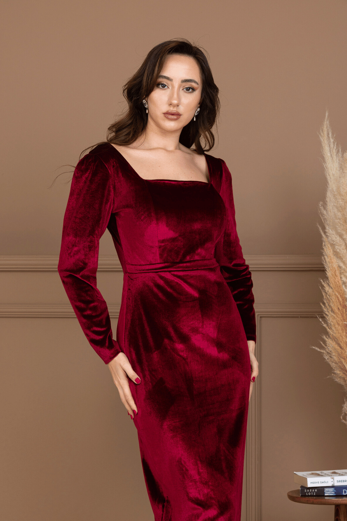 Kadife Kumaş Kare Yaka Elbise - BORDO Kadife Kumaş Kare Yaka Elbise - BORDO BB-GYM-196 50