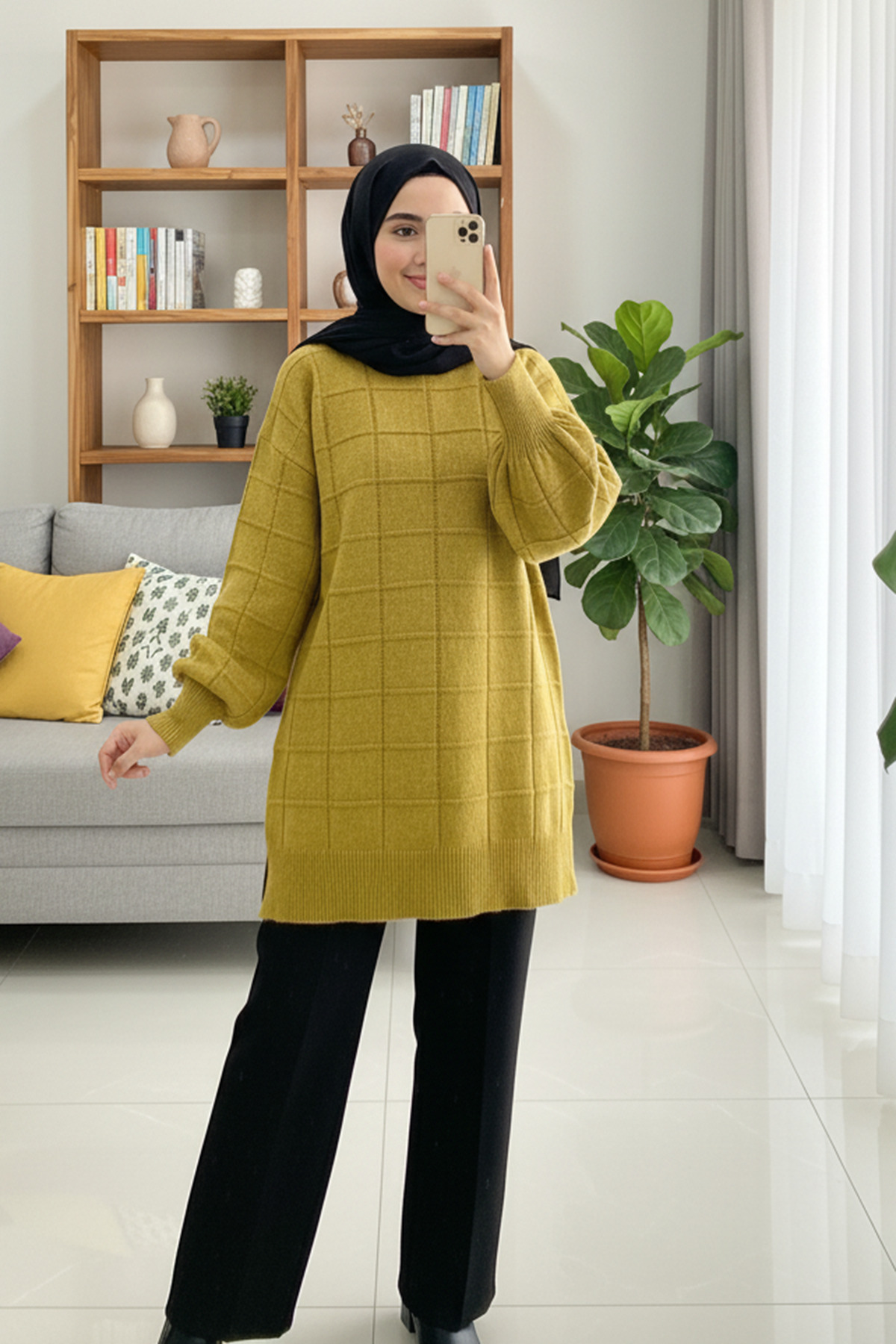 Kare Desen Detaylı Yumoş İp Triko Kazak Tunik Kare Desen Detaylı Yumoş İp Triko Kazak Tunik 12-4510 Standart