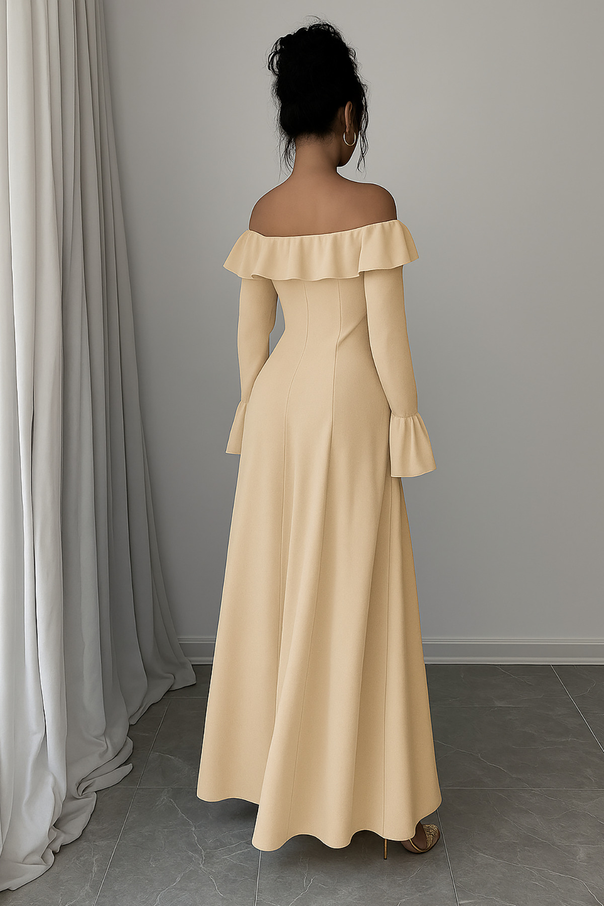 Bej Madonna Yaka Fırfır Detay Uzun Kollu Krep Kumaş Elbise Bej Madonna Yaka Fırfır Detay Uzun Kollu Krep Kumaş Elbise DFX395540 XL