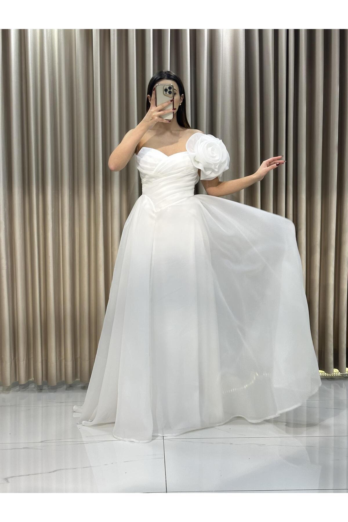 Beyaz Tek Omuz Kloş Tül Abiye 5161 Beyaz Tek Omuz Kloş Tül Abiye 5161 HT5161 42