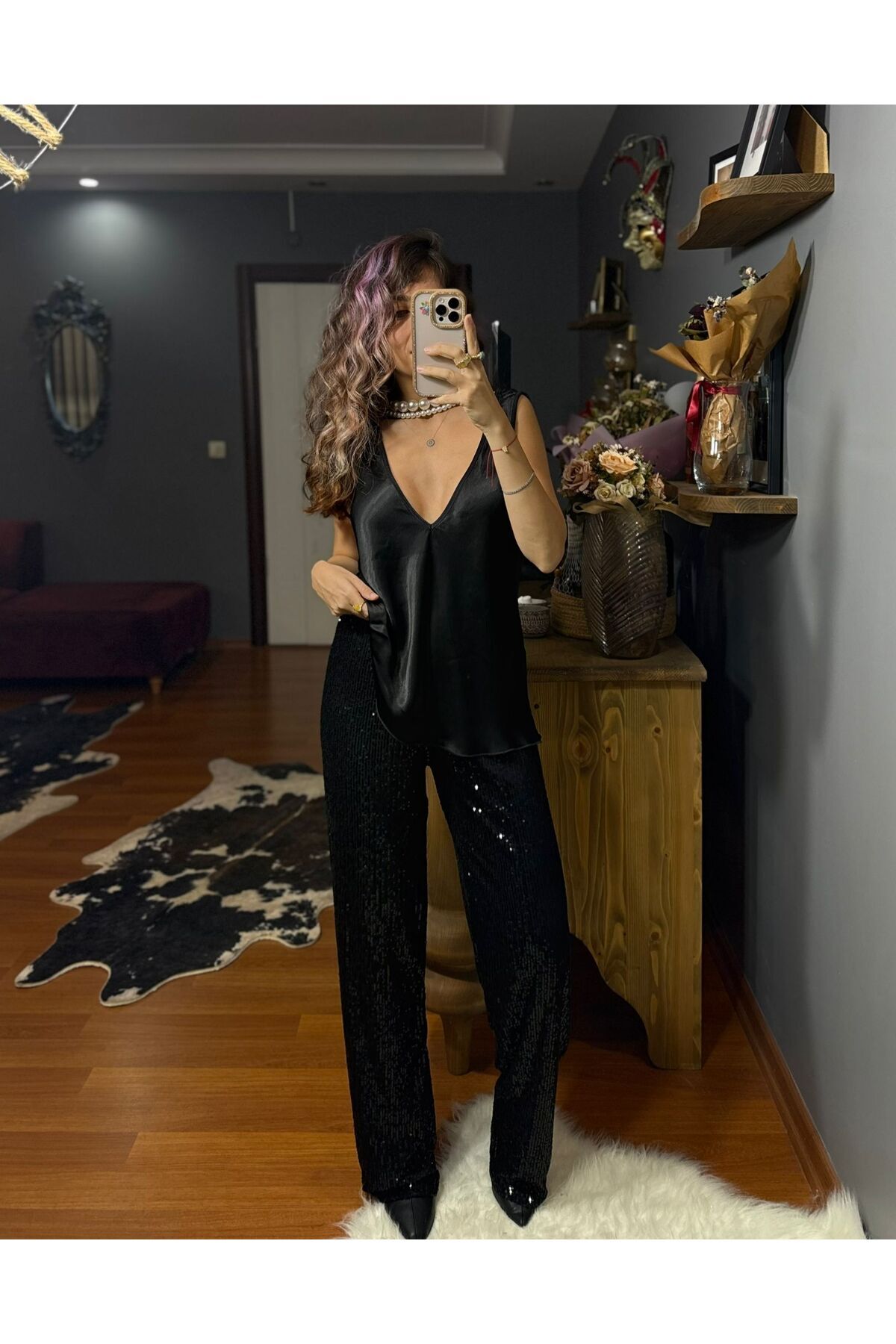 Pullu Beli Lastikli Salaş Pantolon Pullu Beli Lastikli Salaş Pantolon df4444-98 L