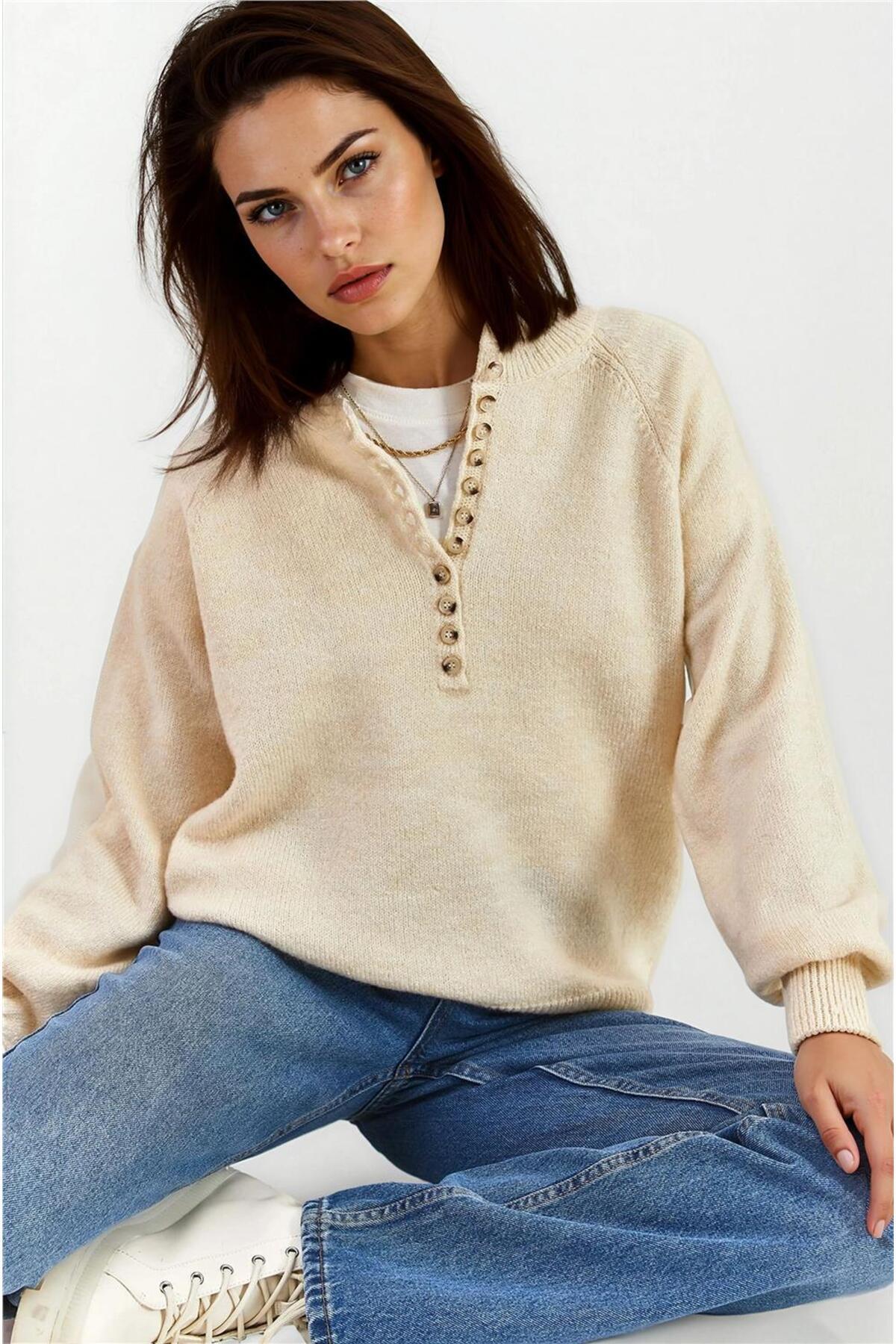 Krem Yarım Fermuarlı Relaxed Fit Akrilik Kazak Krem Yarım Fermuarlı Relaxed Fit Akrilik Kazak BL-1032 Standart