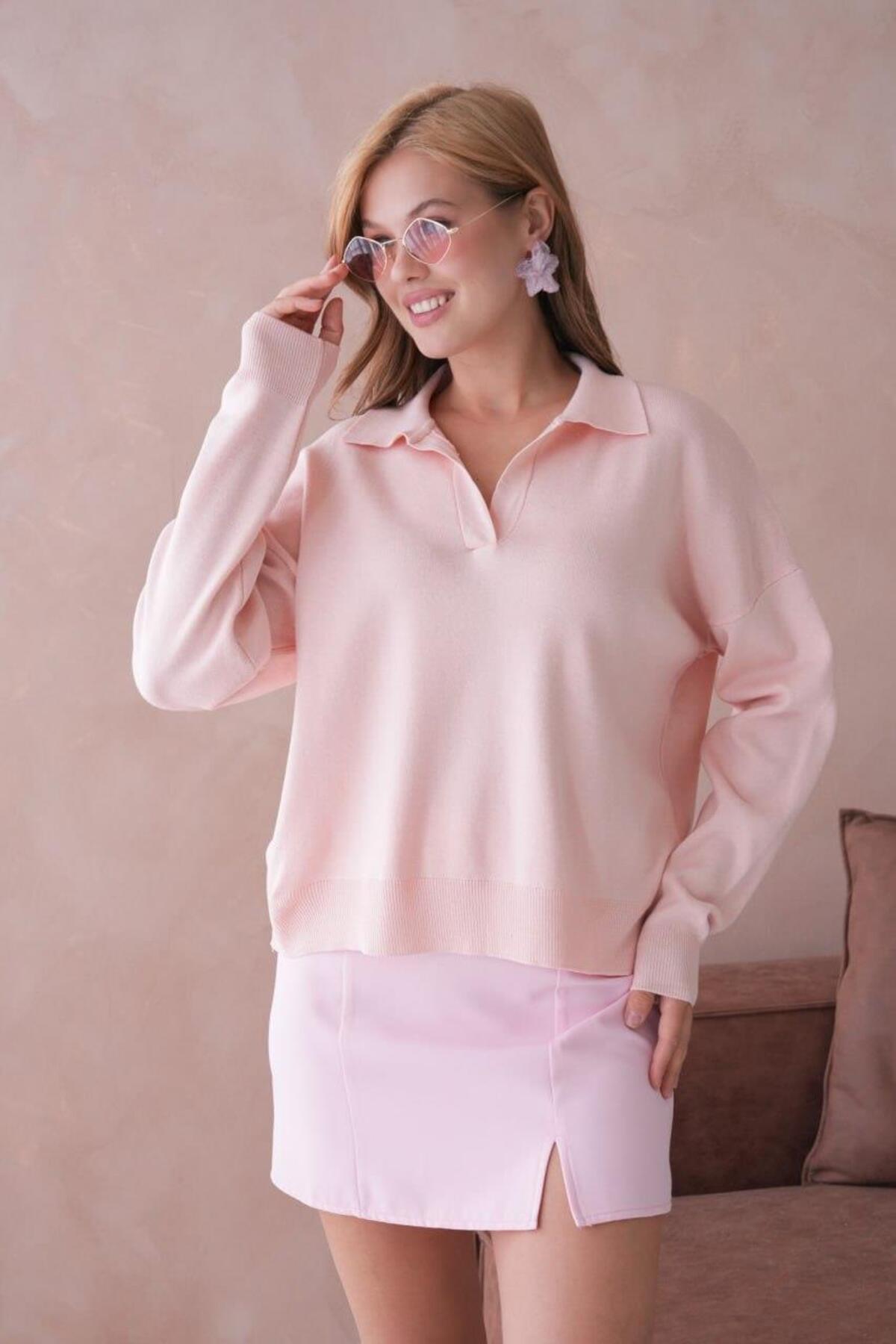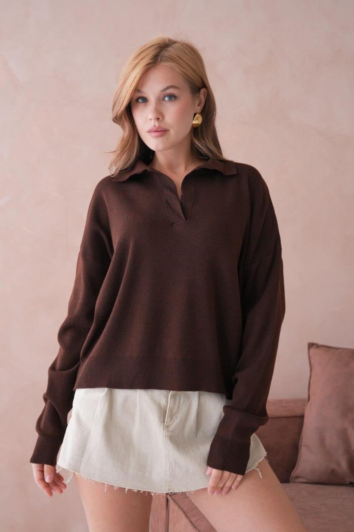 Kadın Polo Yaka Düğmeli Oversize Triko Kazak - 12268R Kadın Polo Yaka Düğmeli Oversize Triko Kazak - 12268R Standart
