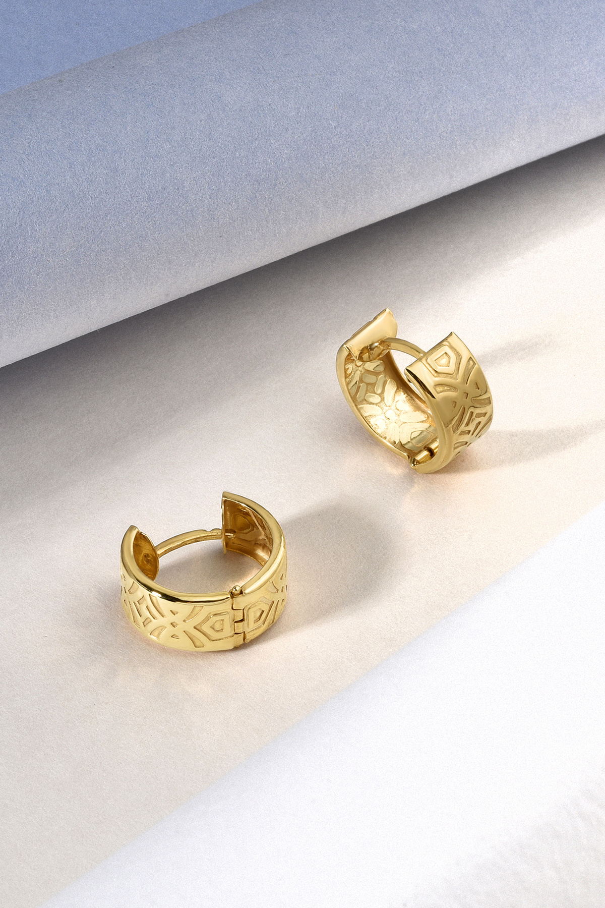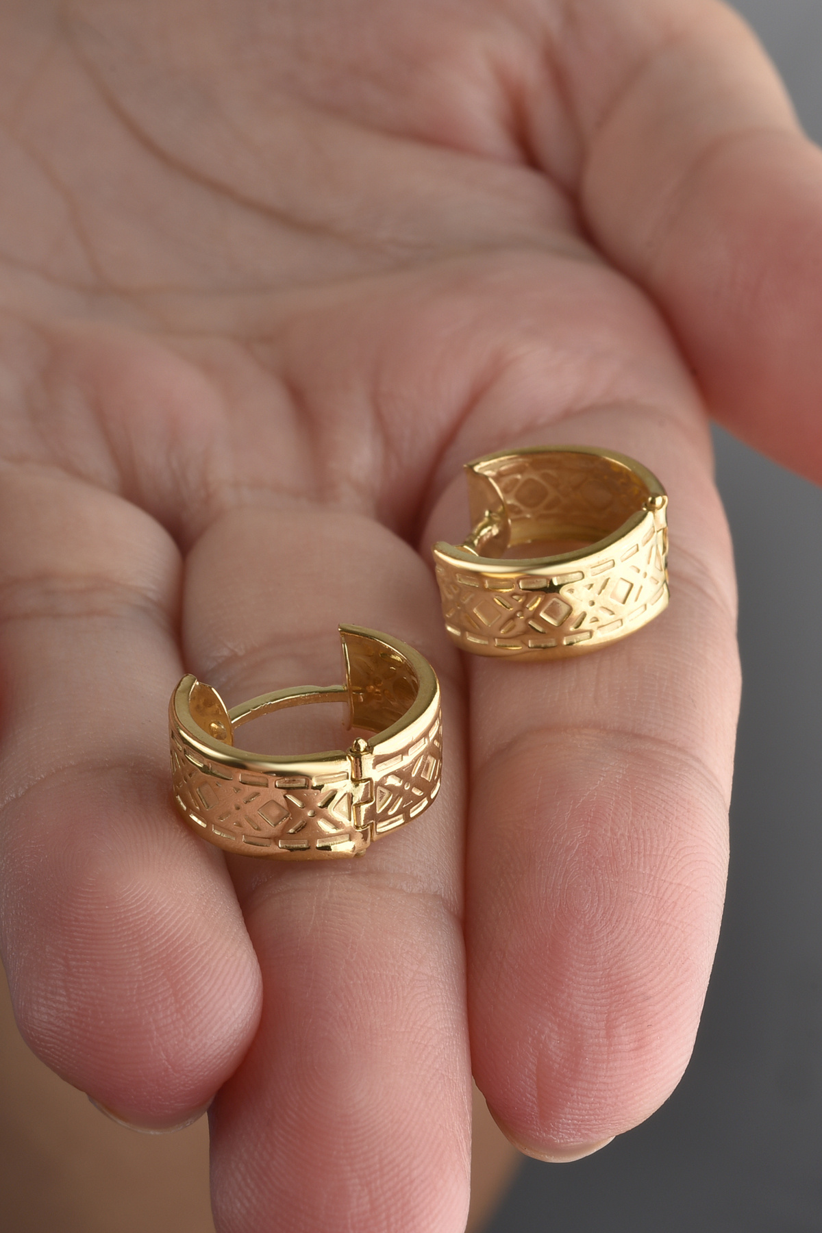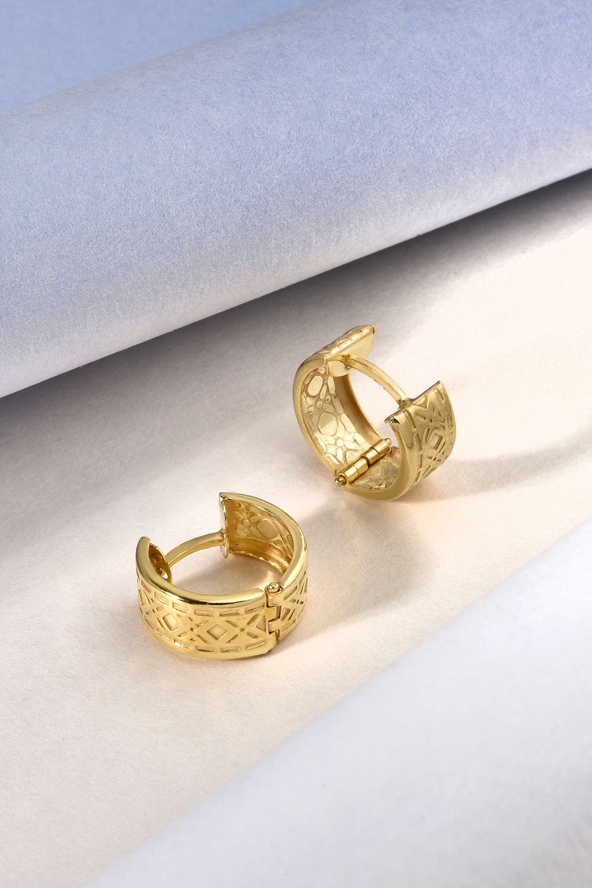 14 Ayar Mikron Altın Kaplama Kalın Desenli Huggie Halka Gümüş Küpe - E00299 14 Ayar Mikron Altın Kaplama Kalın Desenli Huggie Halka Gümüş Küpe - E00299 تک سایز