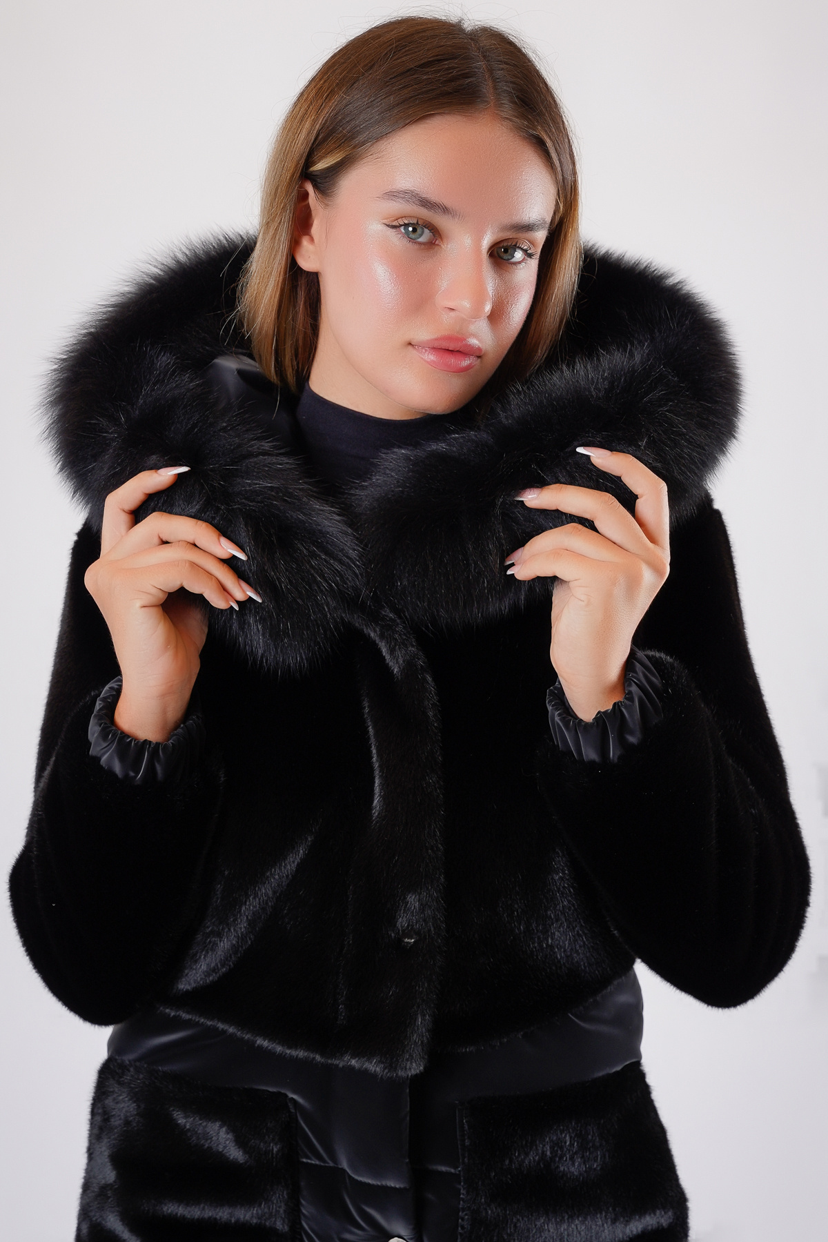 Siyah Mat Fox Kürk Aksesuarlı Puffer Yün Kaban Siyah Mat Fox Kürk Aksesuarlı Puffer Yün Kaban A-9202-3 2XL