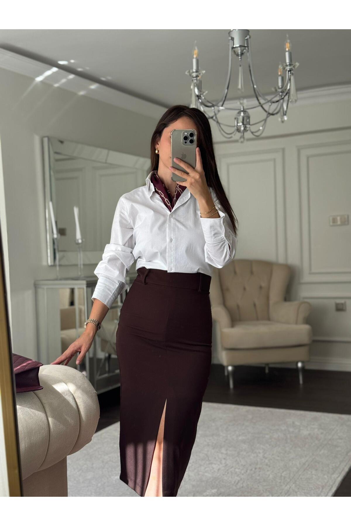 KAHVERENGİ ÖN YIRTMAÇLI MİDİ BOY ETEK KAHVERENGİ ÖN YIRTMAÇLI MİDİ BOY ETEK BSC1342 L