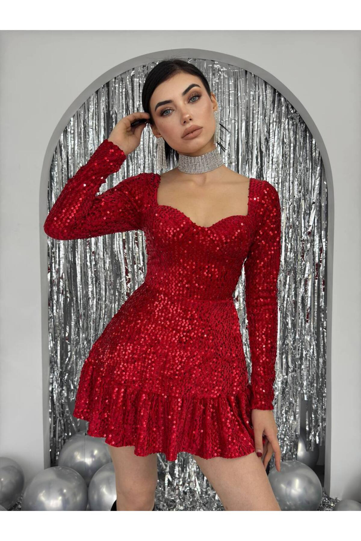 Pileli Kalp Yaka Tasarım Mini Payet Elbise Pileli Kalp Yaka Tasarım Mini Payet Elbise GUL0081 L