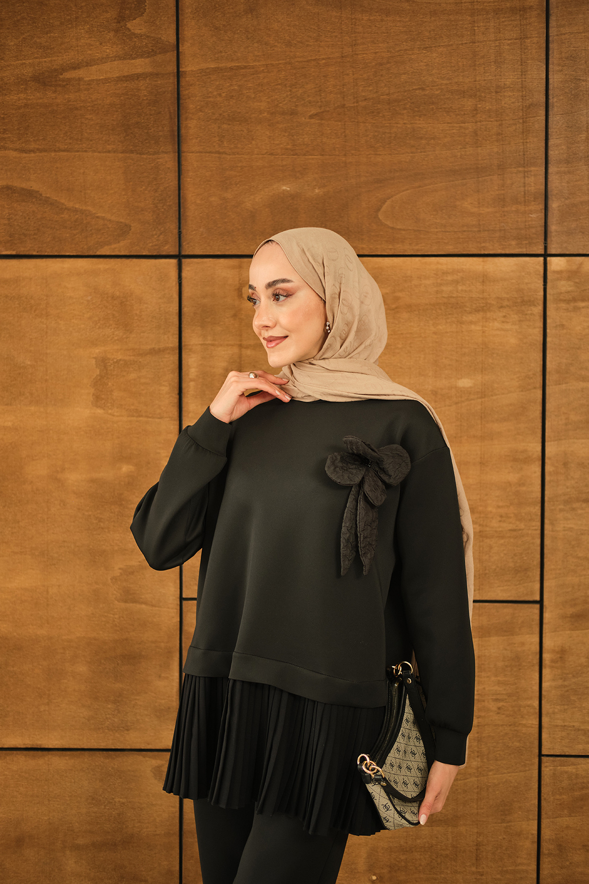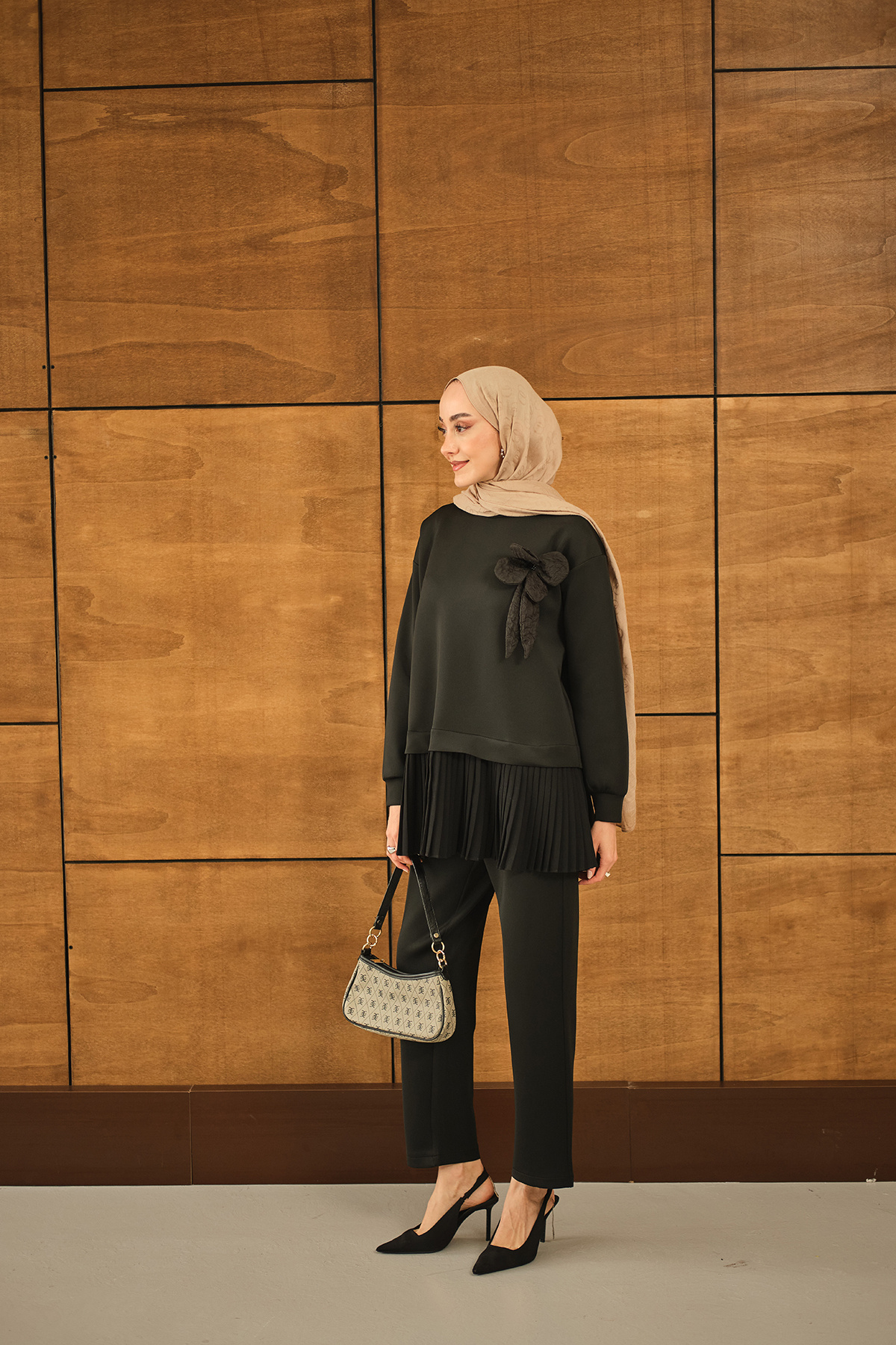 Kadın Çiçek Detay Pliseli Takım Siyah Kadın Çiçek Detay Pliseli Takım Siyah 182-244 L/XL