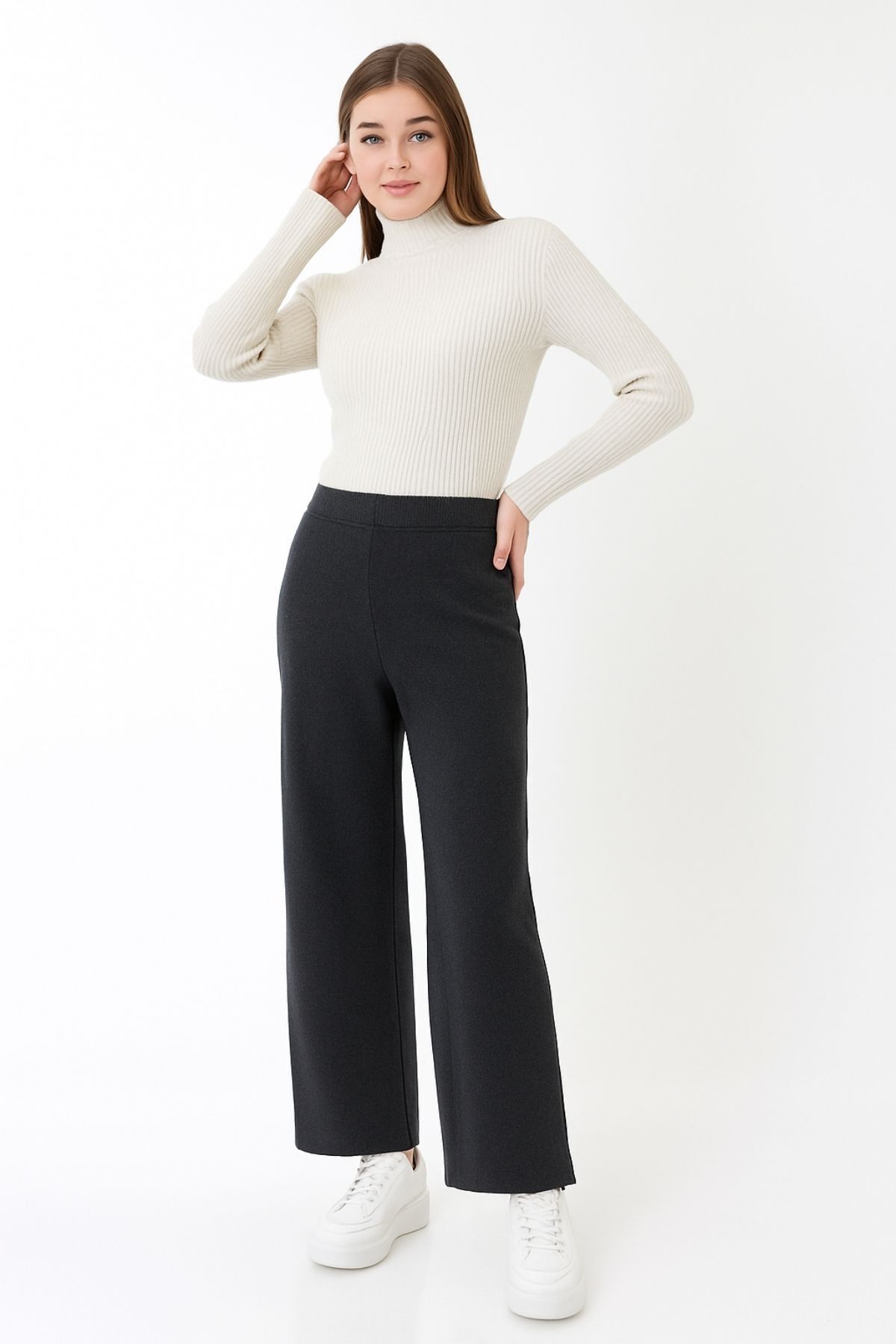 Kadın Antrasit Gri Beli Lastikli Bol Paça Triko Pantolon Kadın Antrasit Gri Beli Lastikli Bol Paça Triko Pantolon DVKA-0902 Standart