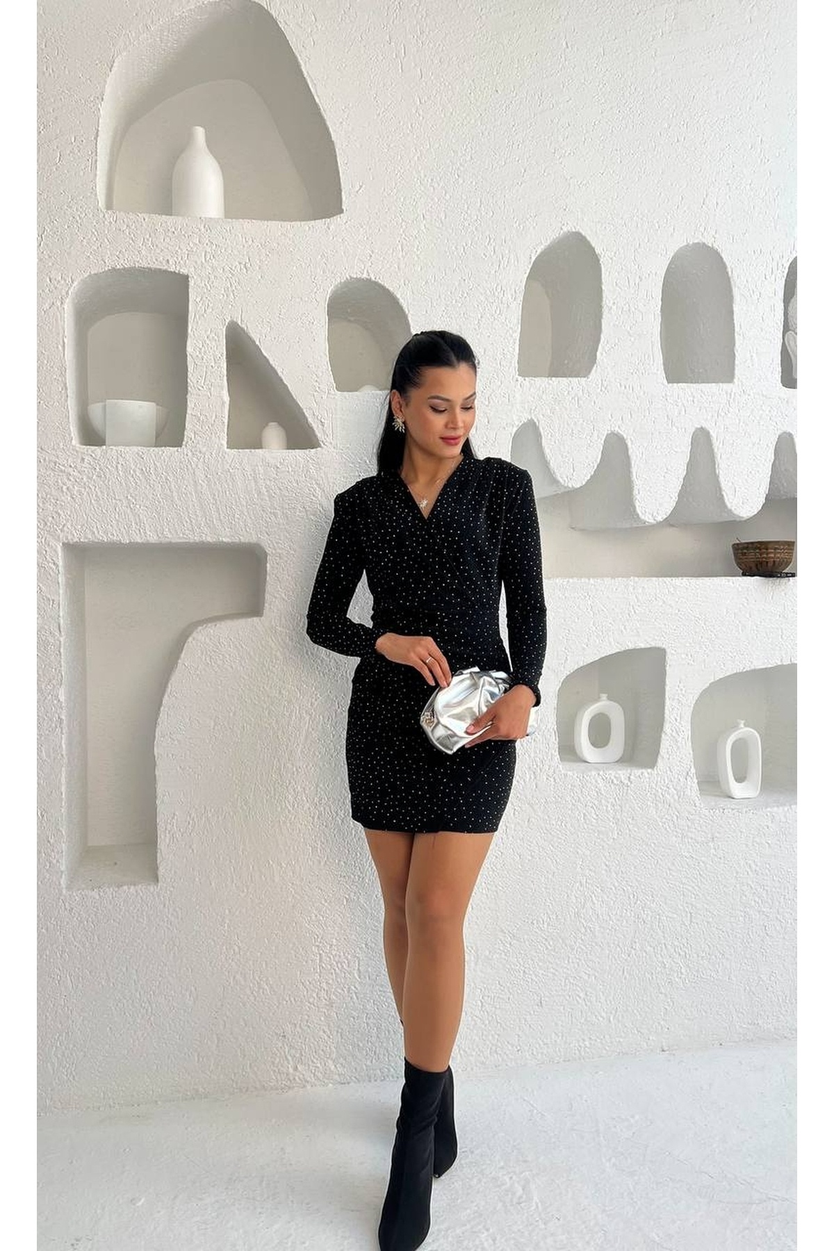 TAŞLI DRAPELİ KRUVAZE YAKA KISA ELBİSE TAŞLI DRAPELİ KRUVAZE YAKA KISA ELBİSE GRS3835 XL
