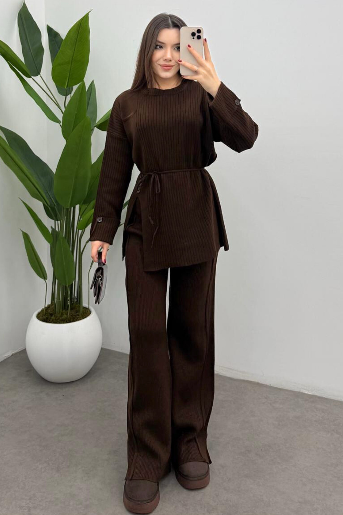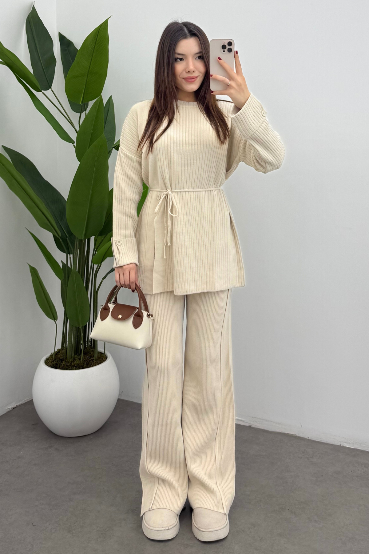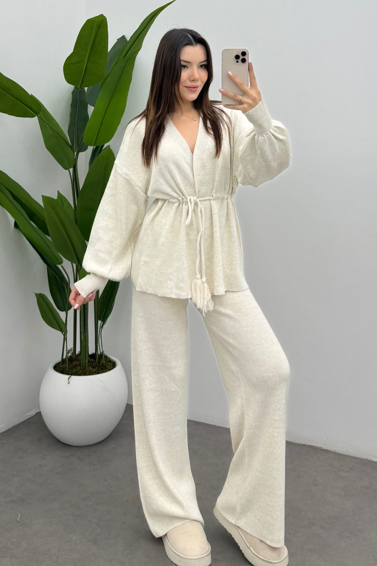 Kadın Ekru Beli Püskül Bağcık Detaylı Hırka Pantolon İkili Triko Takım Kadın Ekru Beli Püskül Bağcık Detaylı Hırka Pantolon İkili Triko Takım Sam01 Standart