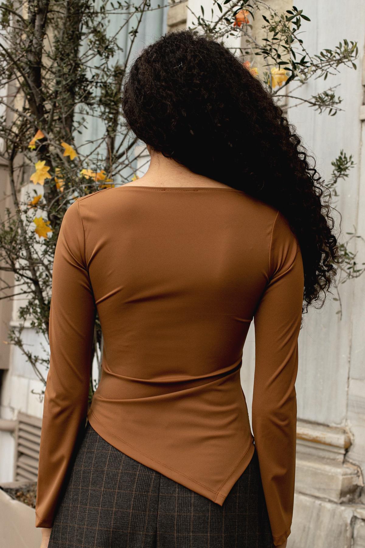 Kadın Likralı Esnek Hafif Parlak Kumaş V Yaka Büzgülü Uzun Kol Asimetrik Bluz-Kahve Kadın Likralı Esnek Hafif Parlak Kumaş V Yaka Büzgülü Uzun Kol Asimetrik Bluz-Kahve 20555 XL