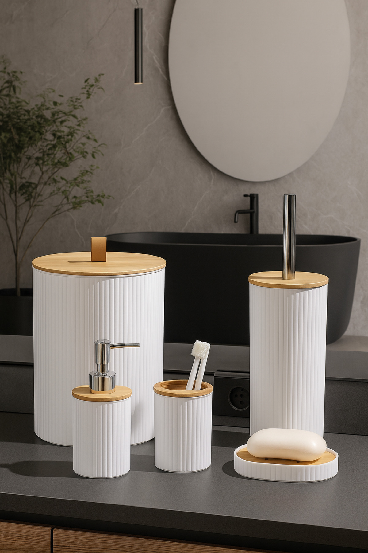 5 Parça Yuvarlak Banyo Seti, Bambu Kapaklı, Beyaz, Hacim: 7 litre 5 Parça Yuvarlak Banyo Seti, Bambu Kapaklı, Beyaz, Hacim: 7 litre MKR-303 تک سایز