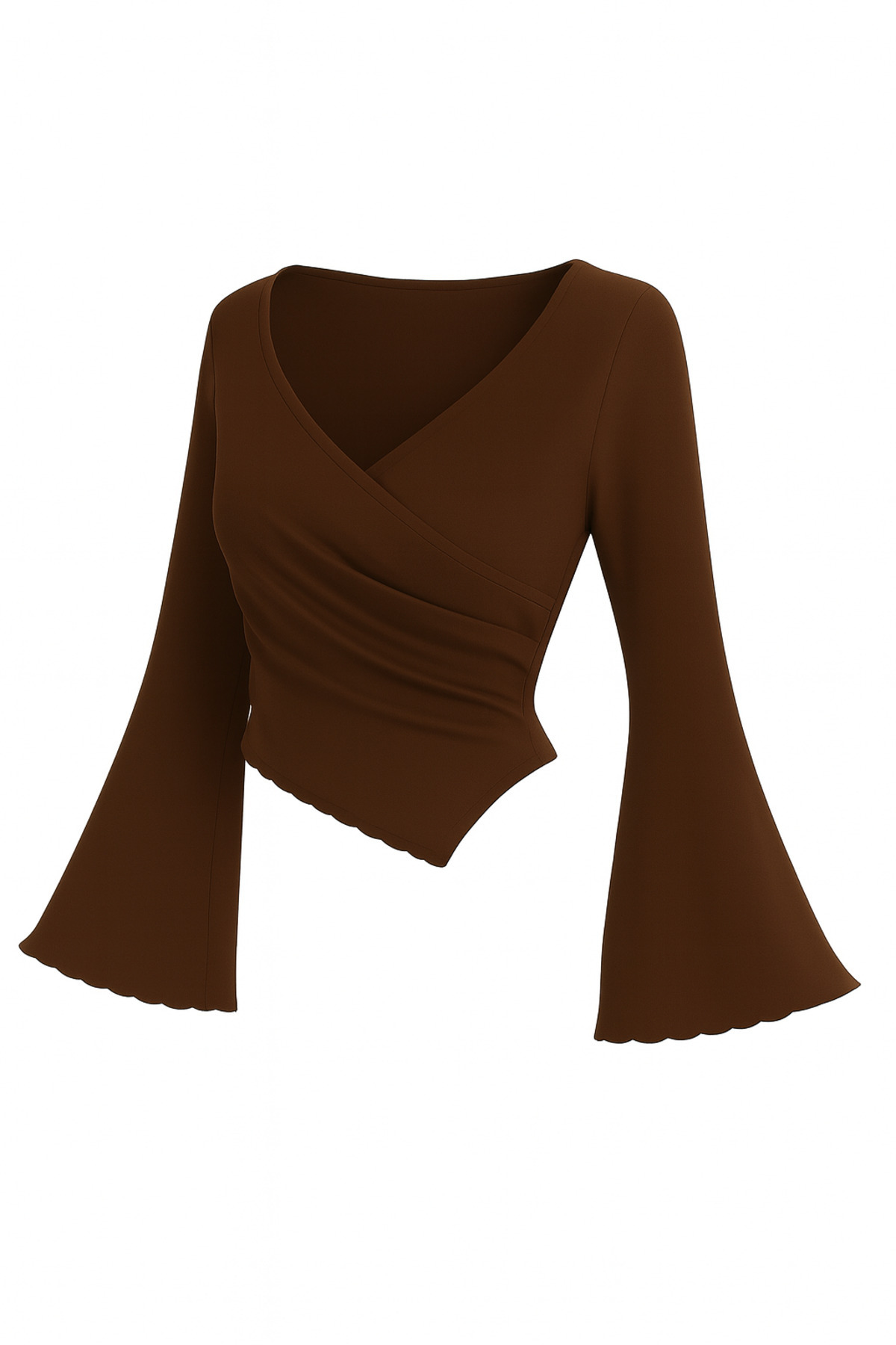 Kahve Drapeli V Yaka İspanyol Kol Asimetrik Kesim Bluz Şık Üst Kahve Drapeli V Yaka İspanyol Kol Asimetrik Kesim Bluz Şık Üst PENSLİ35 XL