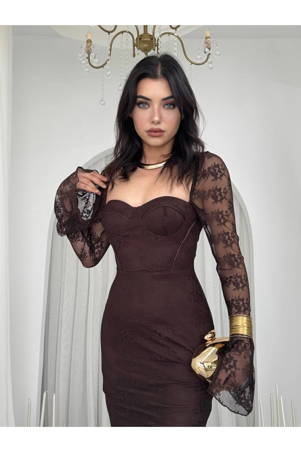 Fost Uzun Kollu Dantel Tül Midi Elbise Fost Uzun Kollu Dantel Tül Midi Elbise Etika00735 L