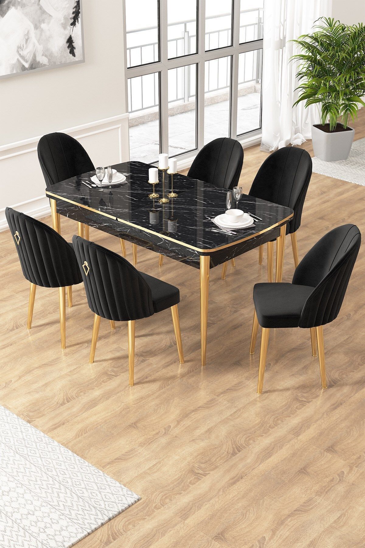 Pir Serisi 80x130 Sabit Siyah Mermer Desen Kahve Ayak Masa Takımı 6 Krem Sandalye Pir Serisi 80x130 Sabit Siyah Mermer Desen Kahve Ayak Masa Takımı 6 Krem Sandalye 22PİRSYHMRKHV06 تک سایز
