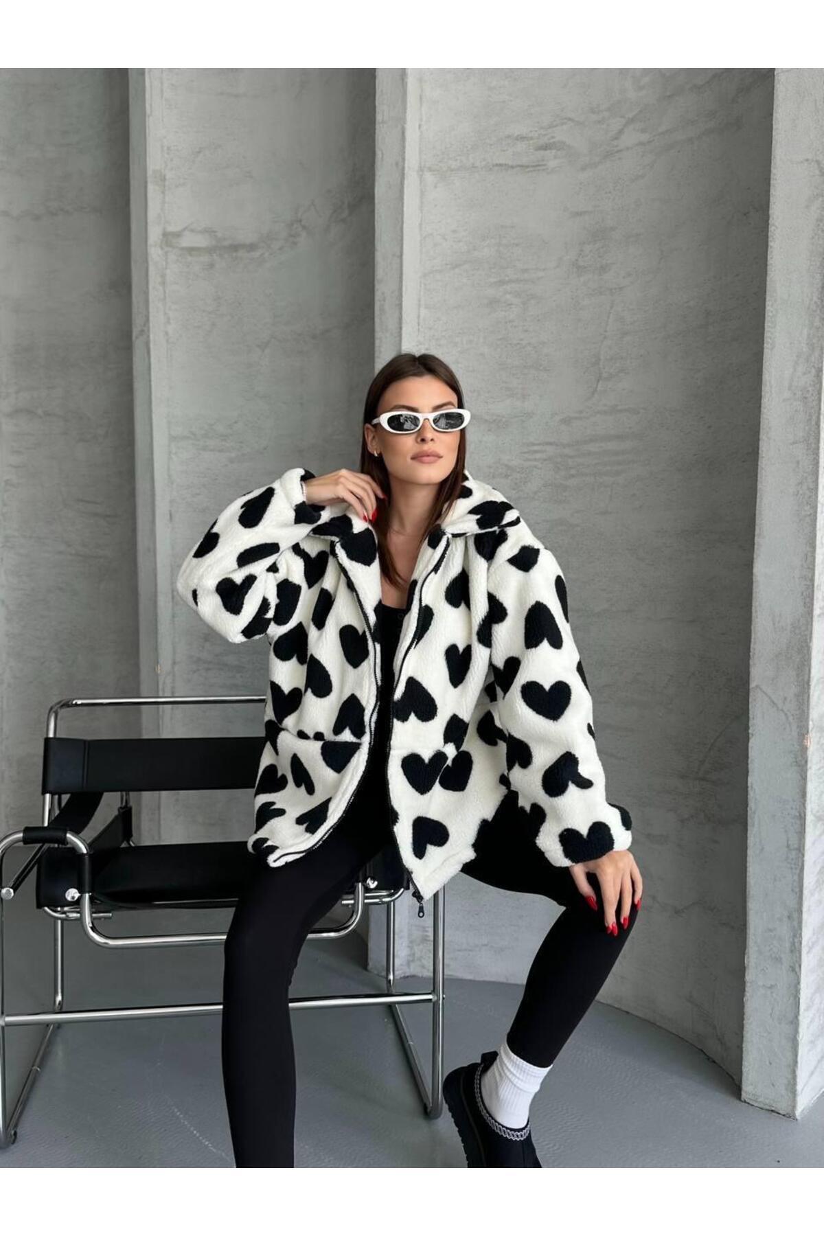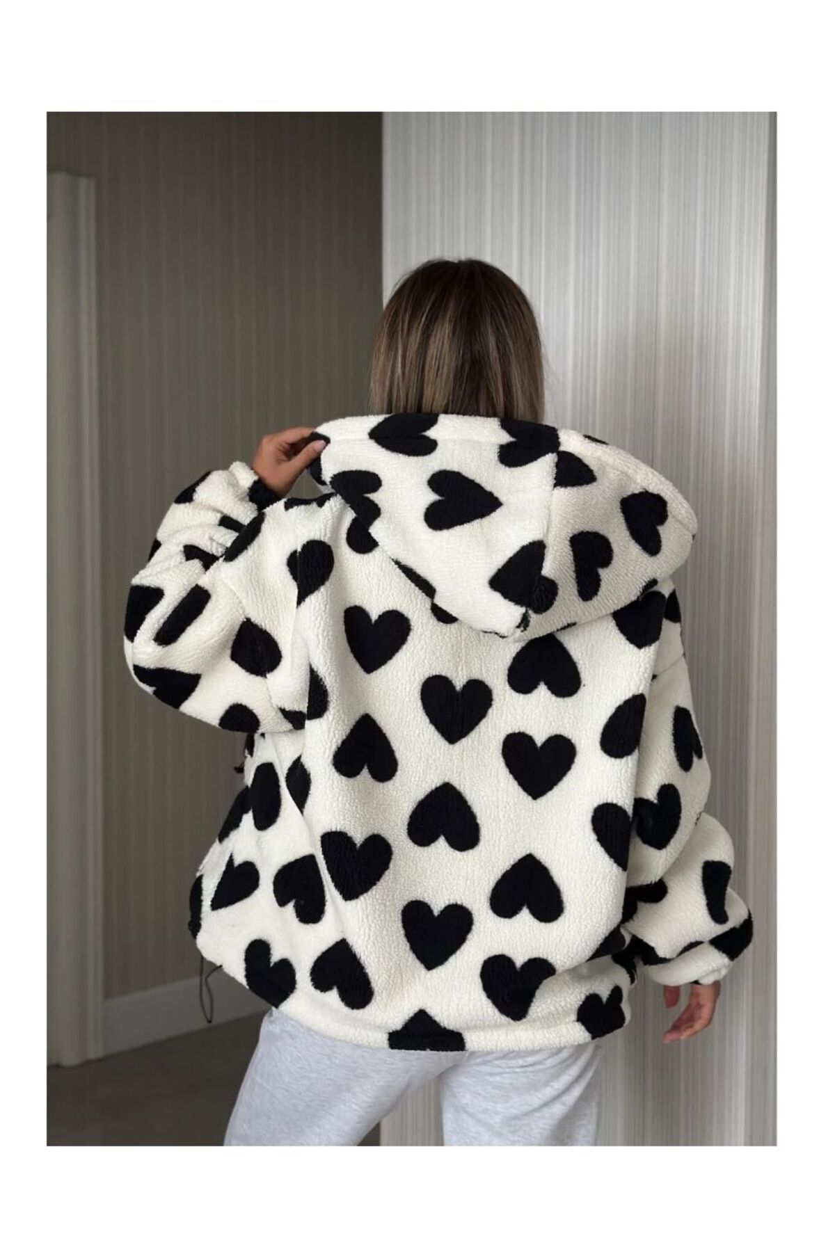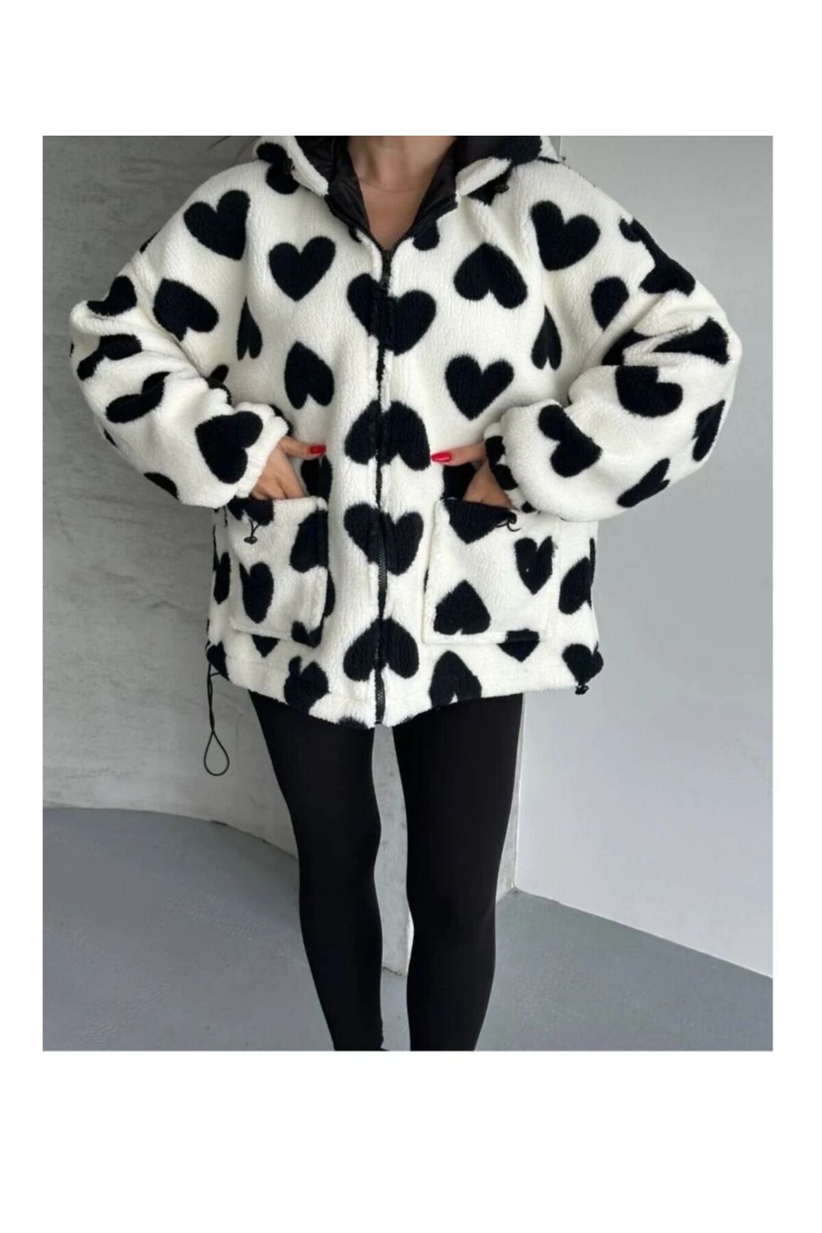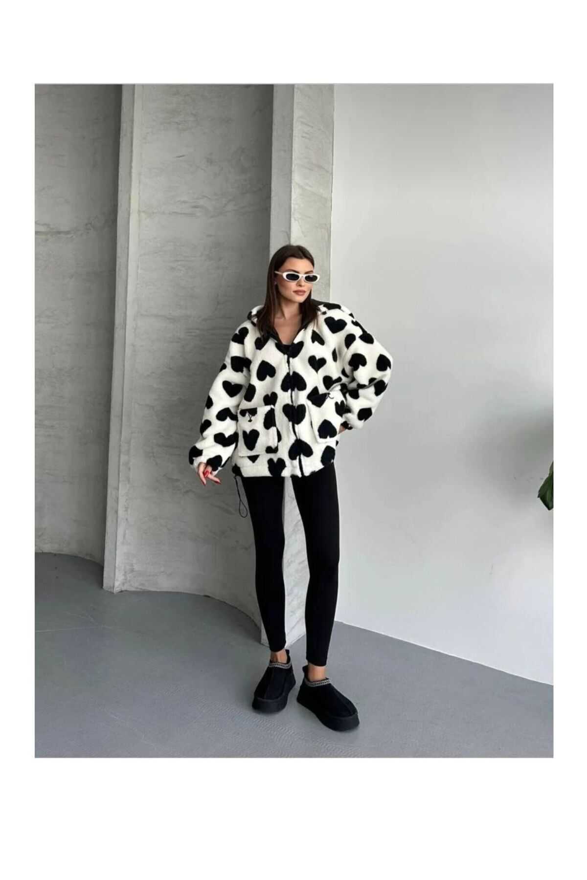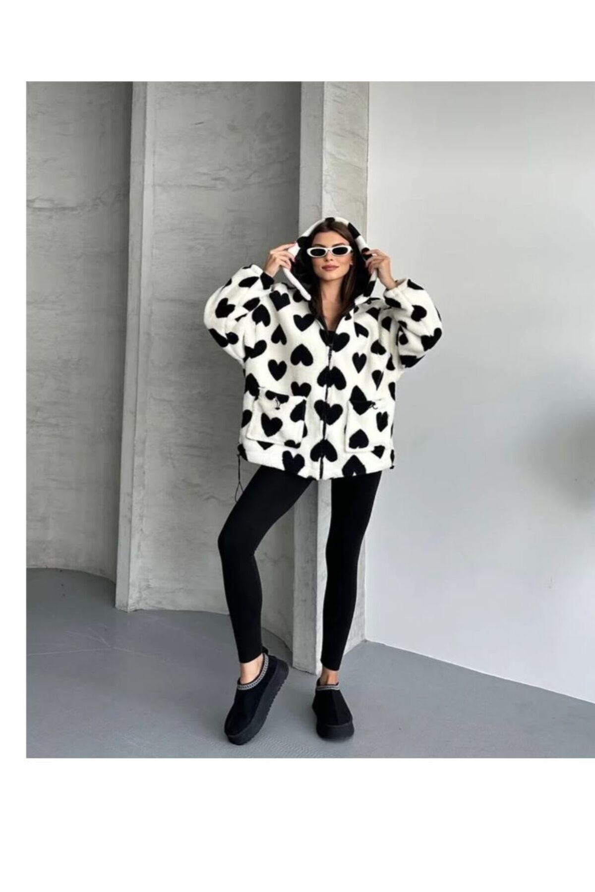 Kadın Siyah Beyaz Kapüşonlu Kalpli Peluş Mont ASTARLI Kadın Siyah Beyaz Kapüşonlu Kalpli Peluş Mont ASTARLI kalpli Standart