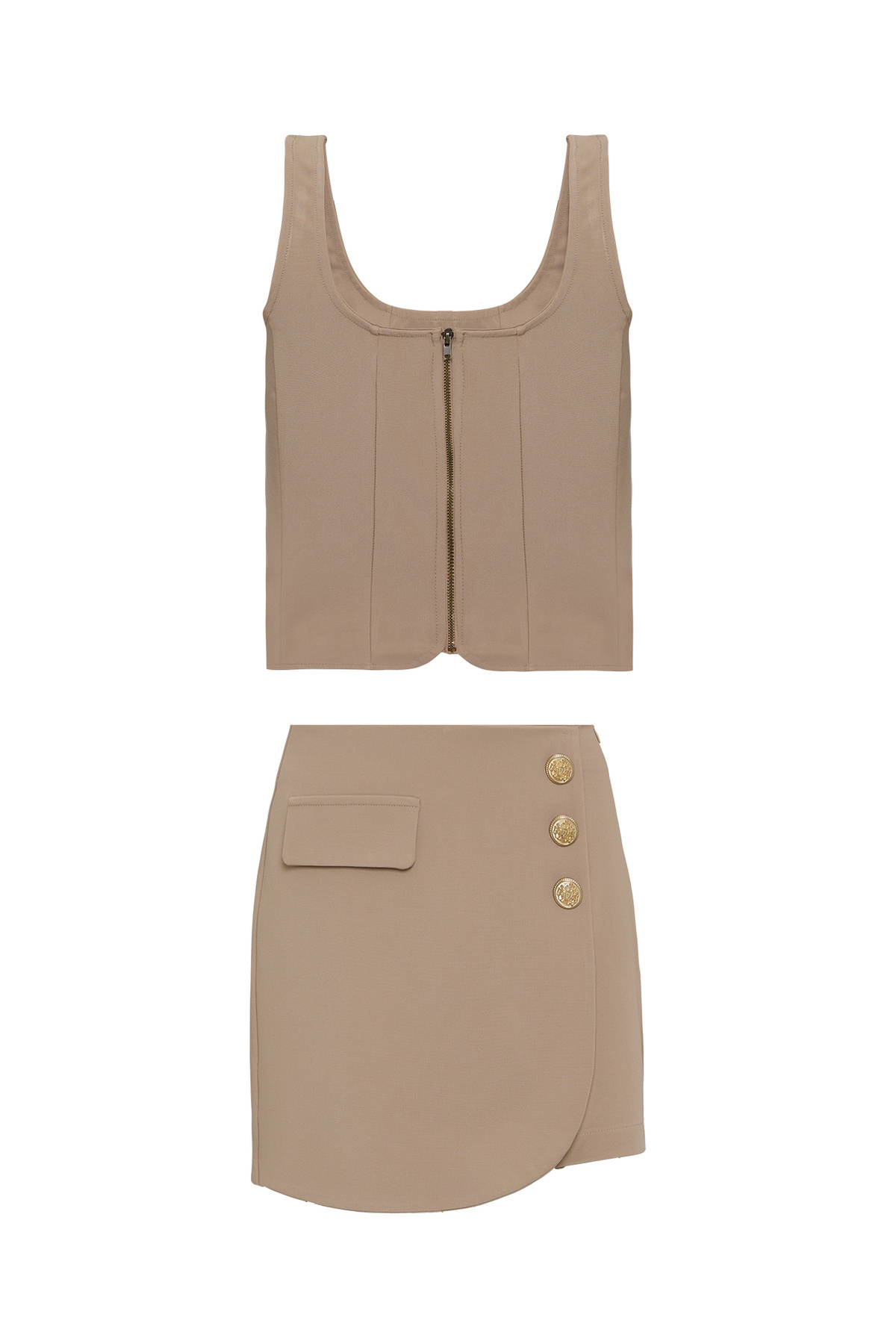 Kadın Bej Rengi Altın Düğme Detaylı Şort Etek Fermuarlı Yelek Takım Kadın Bej Rengi Altın Düğme Detaylı Şort Etek Fermuarlı Yelek Takım eight81747 XL