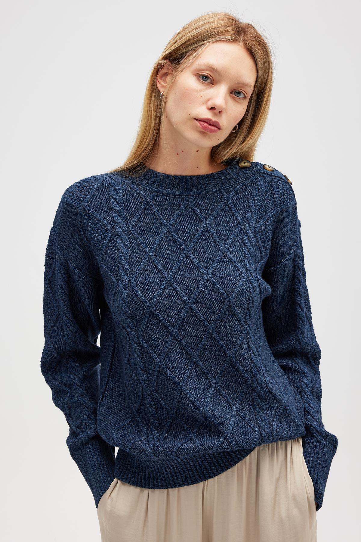 Daphne Saç Örgülü Omzu Düğmeli, Kadın Triko Kazak - İndigo Melanj Daphne Saç Örgülü Omzu Düğmeli, Kadın Triko Kazak - İndigo Melanj 13102008 XL