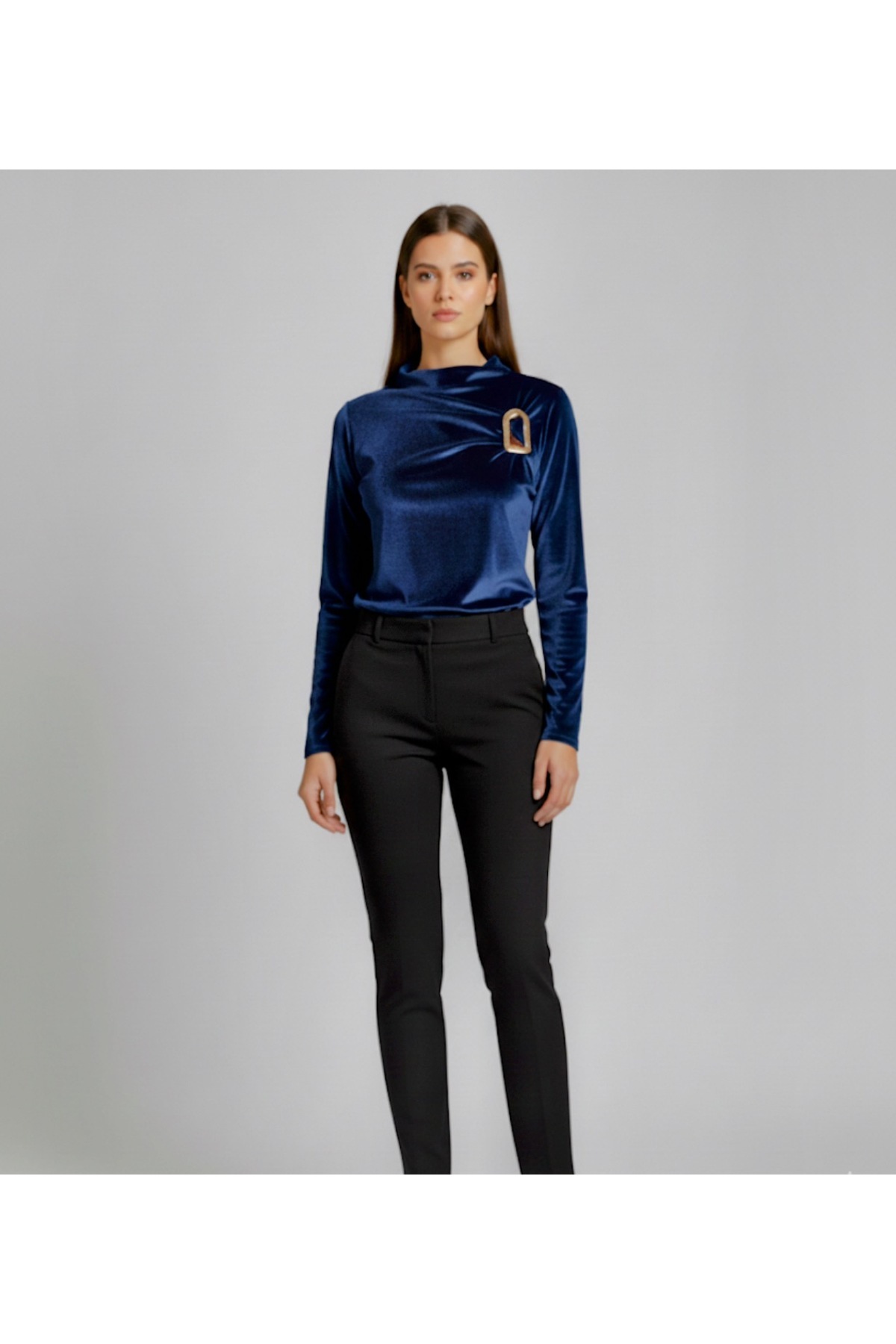 Kadın kruvaze yaka yandan aksesuarlı kadife kumaş bluz Kadın kruvaze yaka yandan aksesuarlı kadife kumaş bluz habdt XL