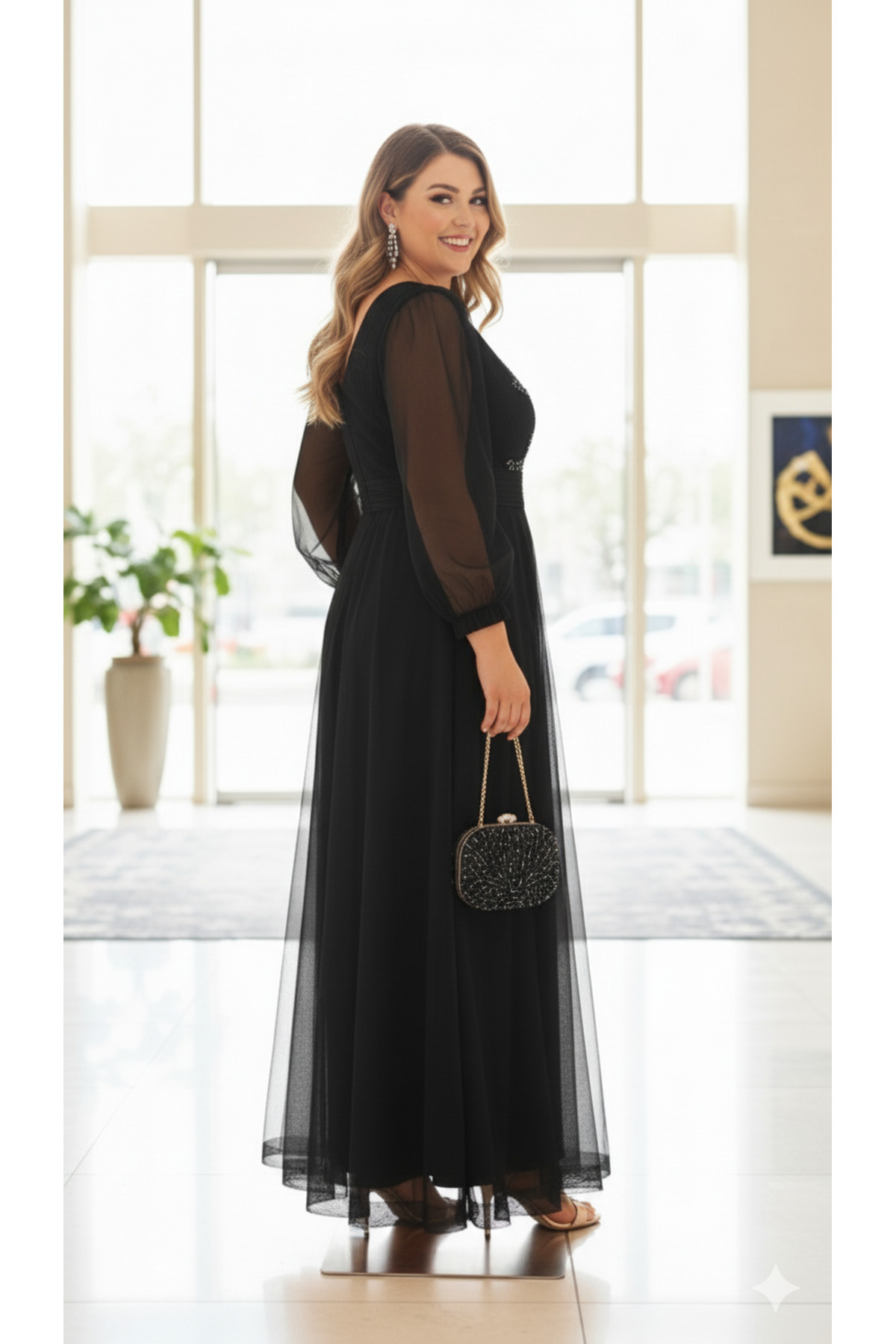 Büyük Beden Şifon Tül Abiye Elbise - Taş İşlemeli/Boncuklu, Uzun Kol, Nişan/Düğün/Özel Gün -994 Büyük Beden Şifon Tül Abiye Elbise - Taş İşlemeli/Boncuklu, Uzun Kol, Nişan/Düğün/Özel Gün -994 ROB994 50