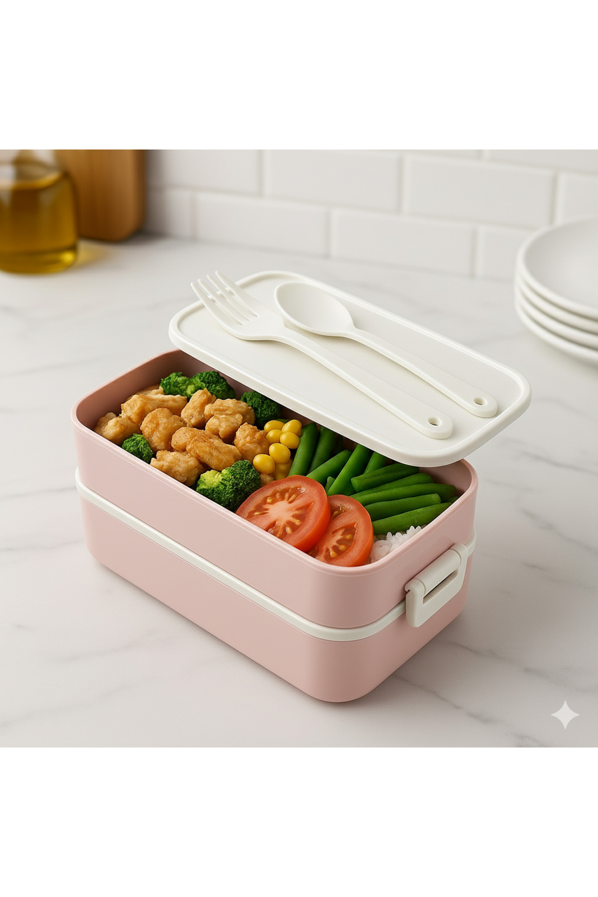 Lunch Box Kendinden Çatal Kaşıklı Estetik 2 Katlı Taşınabilir Yemek Kabı Lunch Box Kendinden Çatal Kaşıklı Estetik 2 Katlı Taşınabilir Yemek Kabı BytaLunchBox تک سایز