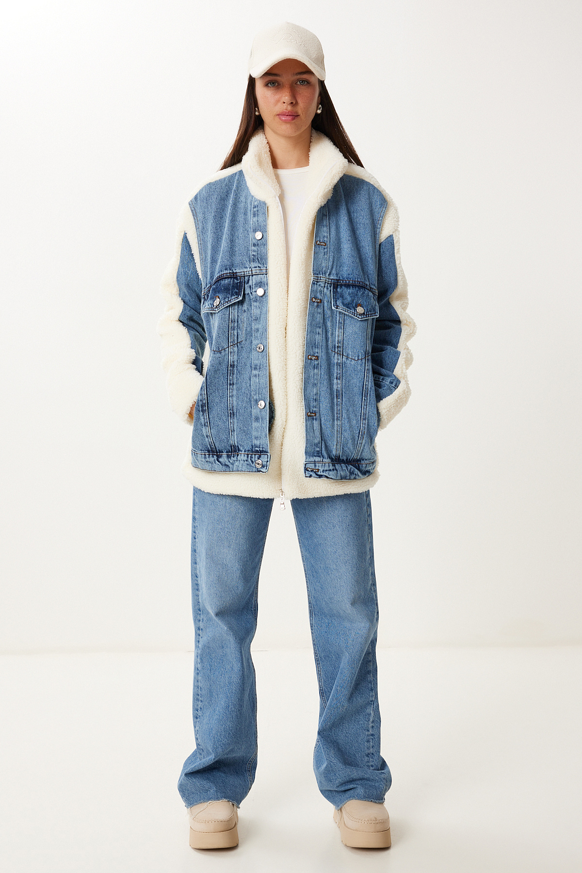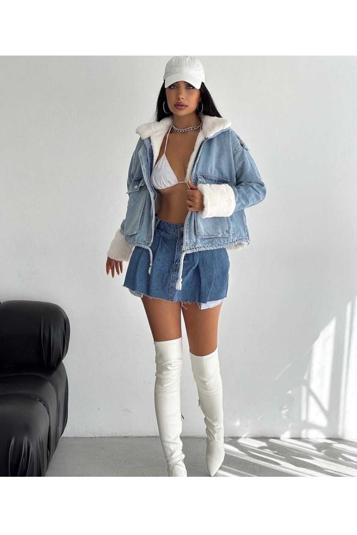 Kadın Ekru Mavi Jean Garnili Fermuarlı Kuzu Peluş Mont Kadın Ekru Mavi Jean Garnili Fermuarlı Kuzu Peluş Mont 20257109 XL