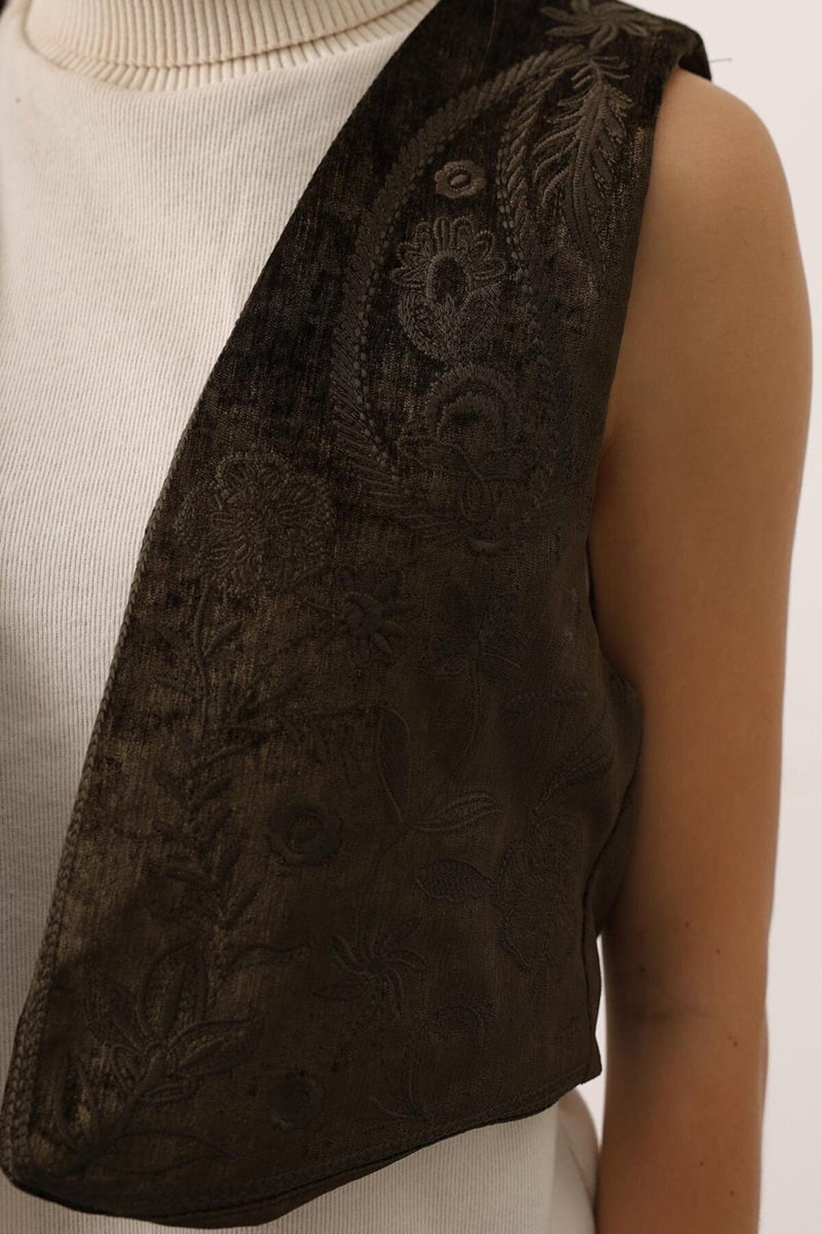 ALAÇATI STİLİ Kadın Haki Kadife Dokulu Jakarlı Desenli Kısa Yelek Vs01413 ALAÇATI STİLİ Kadın Haki Kadife Dokulu Jakarlı Desenli Kısa Yelek Vs01413 VS01413 L