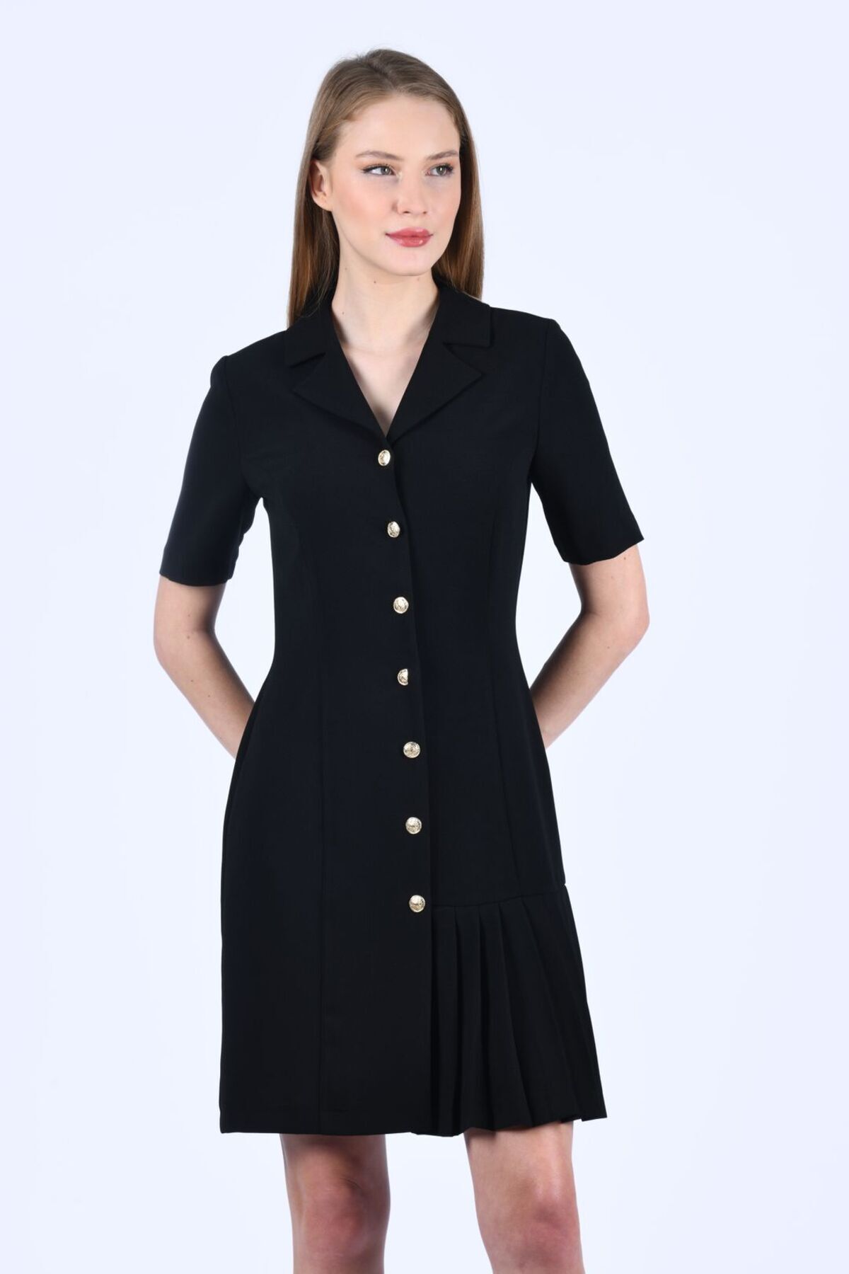 Lacivert Dokulu Düğme Detaylı Elbise - QE379 Lacivert Dokulu Düğme Detaylı Elbise - QE379 QM.K26.ELB.QE379.0001 42