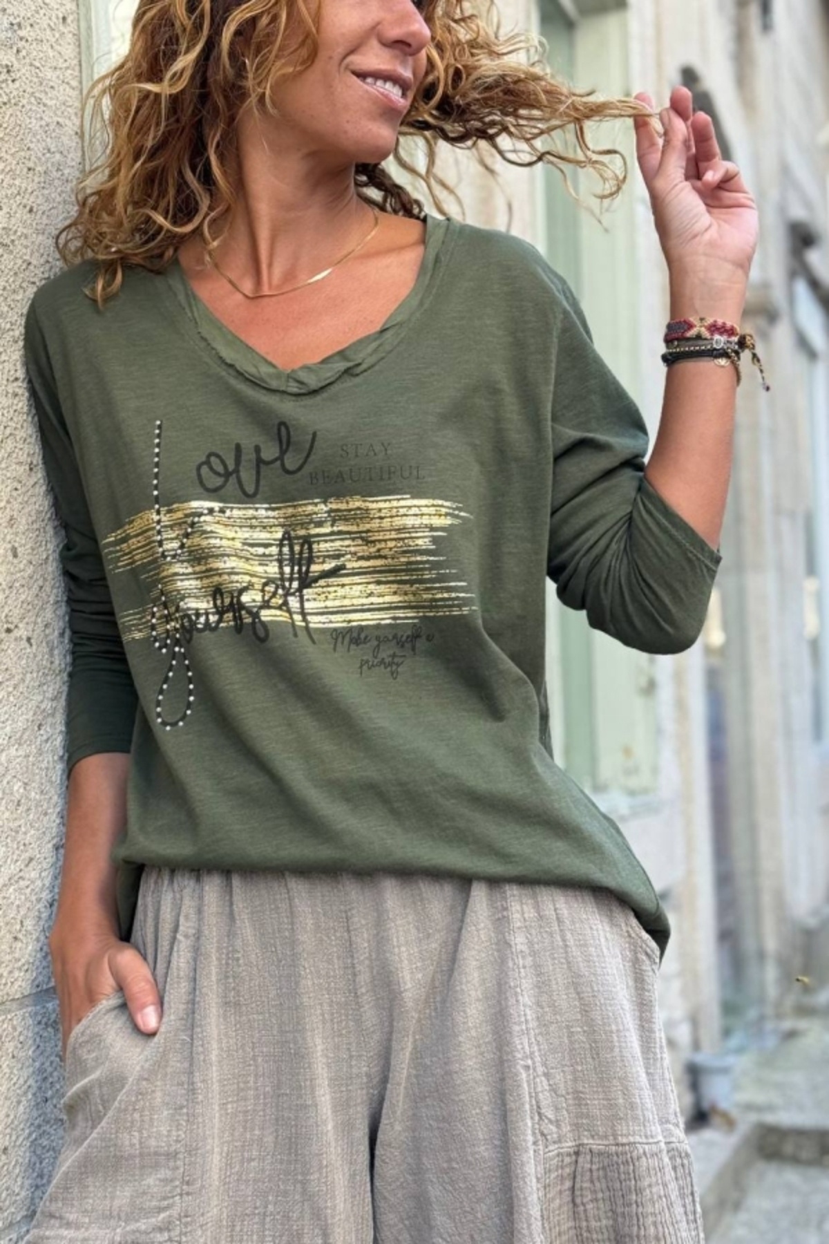İtalyan Haki V Yaka Yumuşak Dokulu Varak Baskılı Pamuklu Bluz 70 50 İtalyan Haki V Yaka Yumuşak Dokulu Varak Baskılı Pamuklu Bluz 70 50 GK-CYL-42022-8 Standart