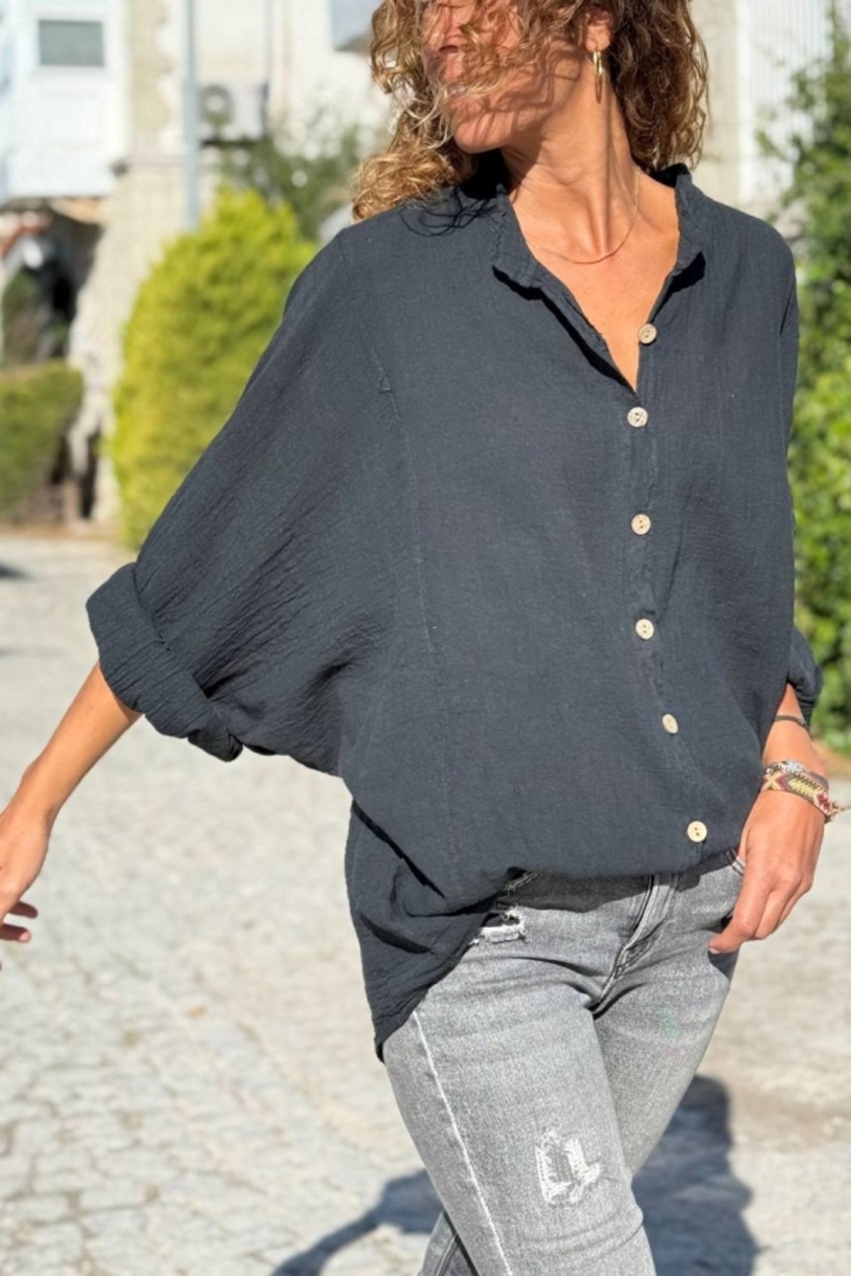 Siyah Yarasa Kol Yıkamalı Pamuklu Salaş Gömlek 75 60 Siyah Yarasa Kol Yıkamalı Pamuklu Salaş Gömlek 75 60 GK-RSD-1191 Standart