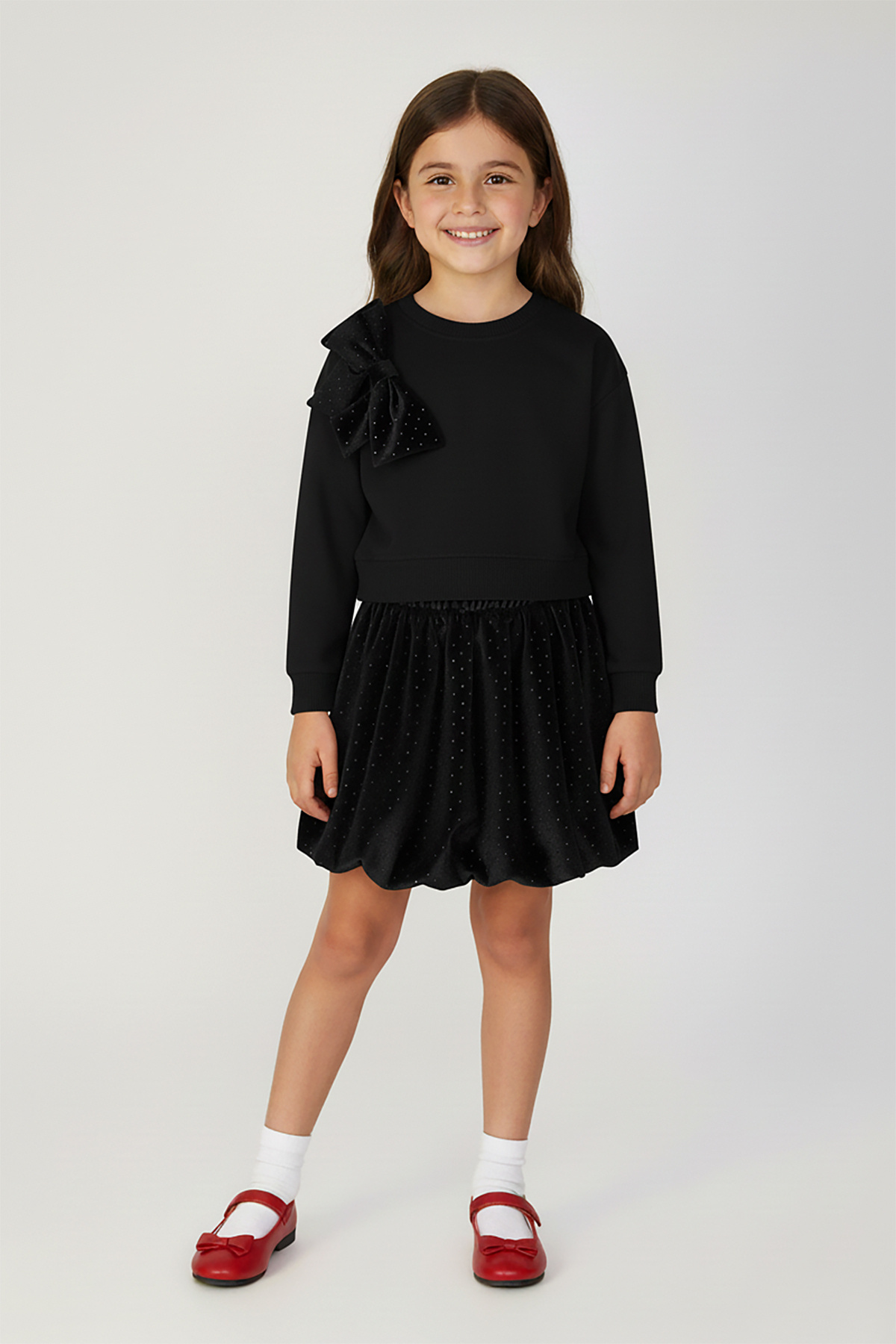 Kız Çocuk Balon Etekli Taş Baskılı Kurdele Detaylı Alt Üst Takım Kız Çocuk Balon Etekli Taş Baskılı Kurdele Detaylı Alt Üst Takım 153.01.0278 8-9 Yaş