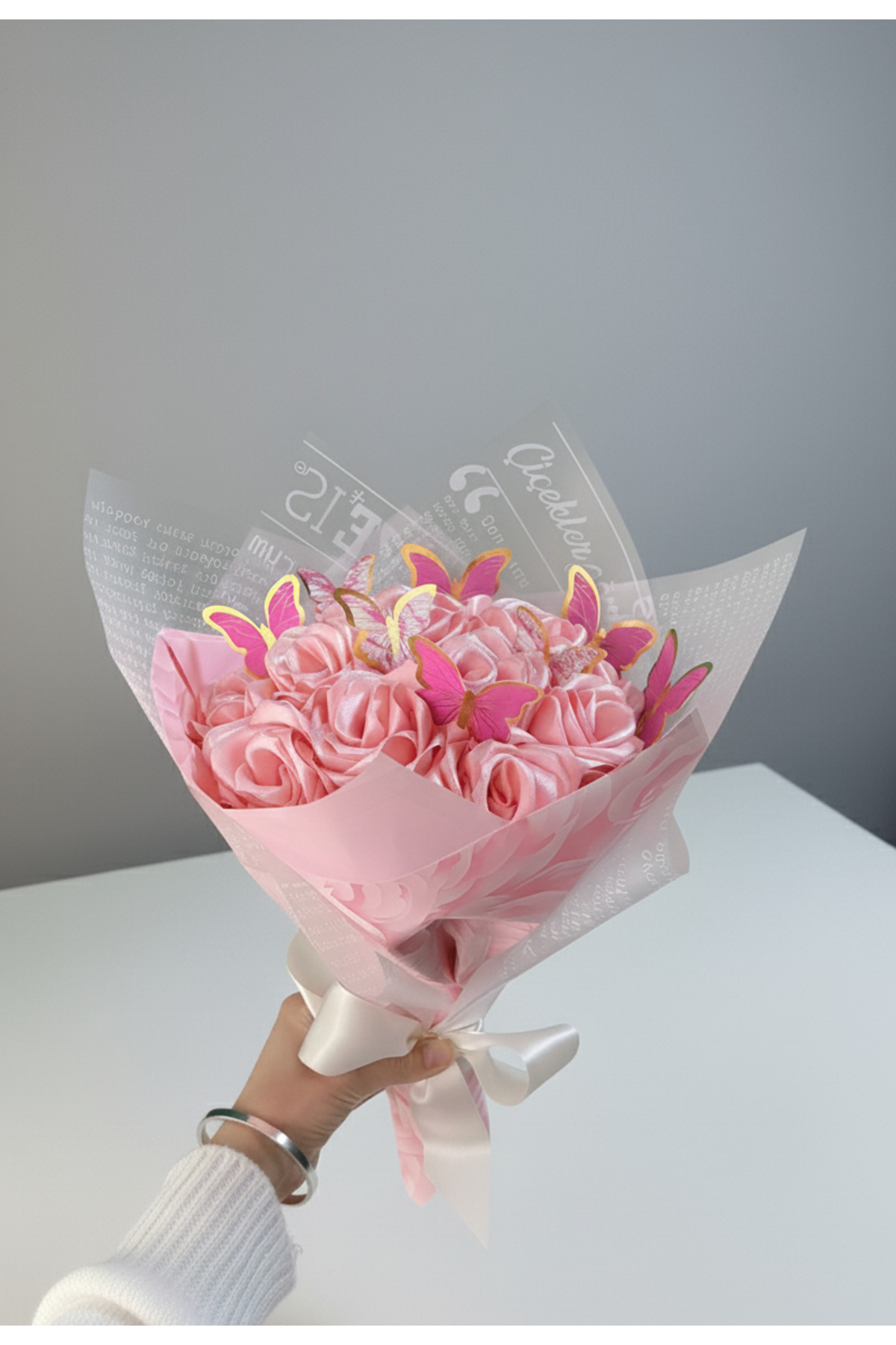 14'lü Pembe Kelebekli Solmayan Saten Gül Buketi, Sevgiliye Hediye, Arkadaşa Hediye 14'lü Pembe Kelebekli Solmayan Saten Gül Buketi, Sevgiliye Hediye, Arkadaşa Hediye SSG-PK-0019 تک سایز